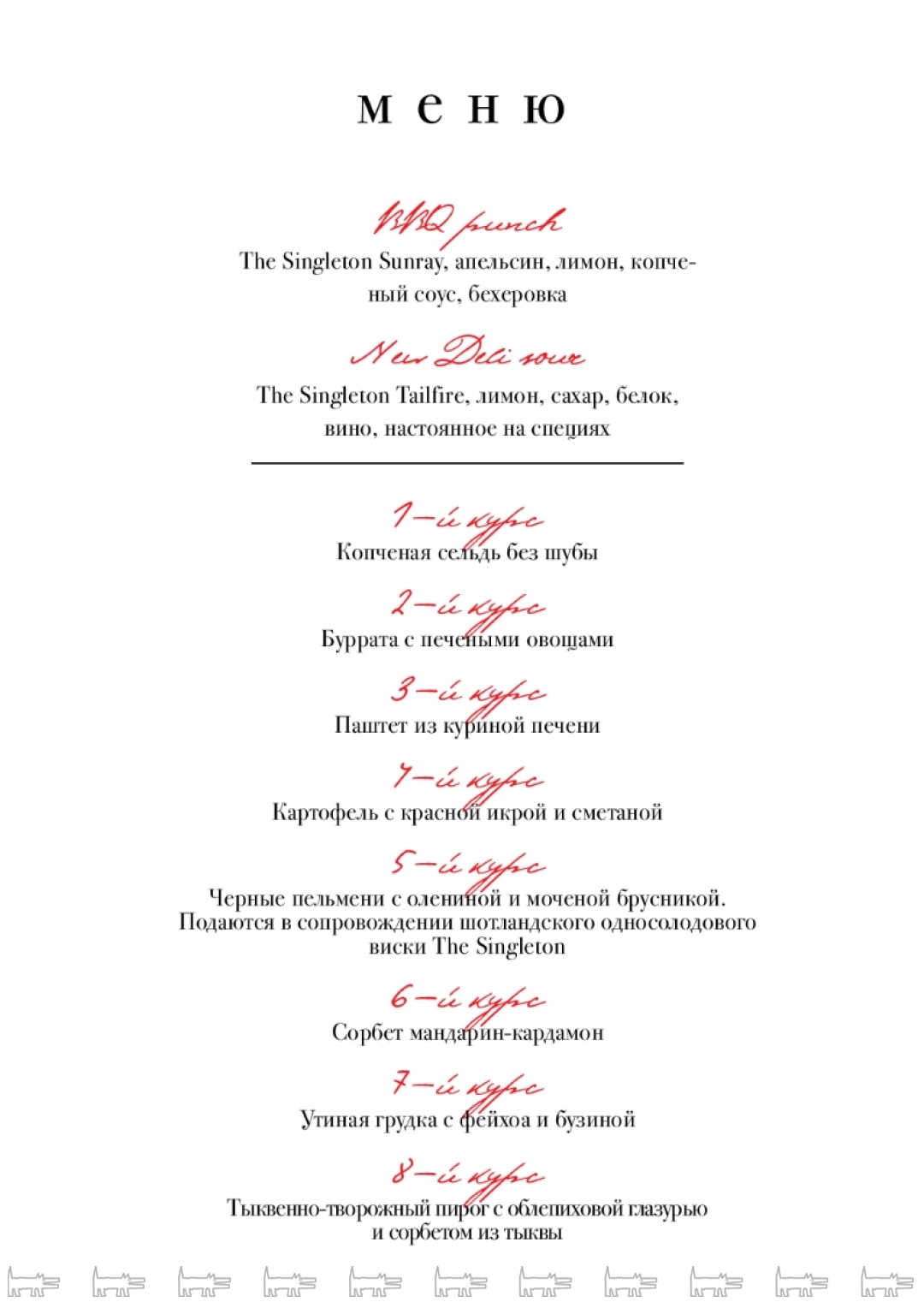 Шеф-повар Станислав Левохо, победитель премии «Что где есть в Петерубрге» 2017 года в номинации «Прорыв среди молодых профессионалов», приготовил для гостей сет из восьми курсов, в который вошли копченая сельдь без шубы, буррата с печеными овощами, картофель с красной икрой и сметаной, тыквенно-творожный пирог с облепиховой глазурью. Партнер ужина The Singleton предложил идеальное сочетание в формате фудпейринг к основному курсу ужина – черным пельменям с олениной и моченой брусникой.