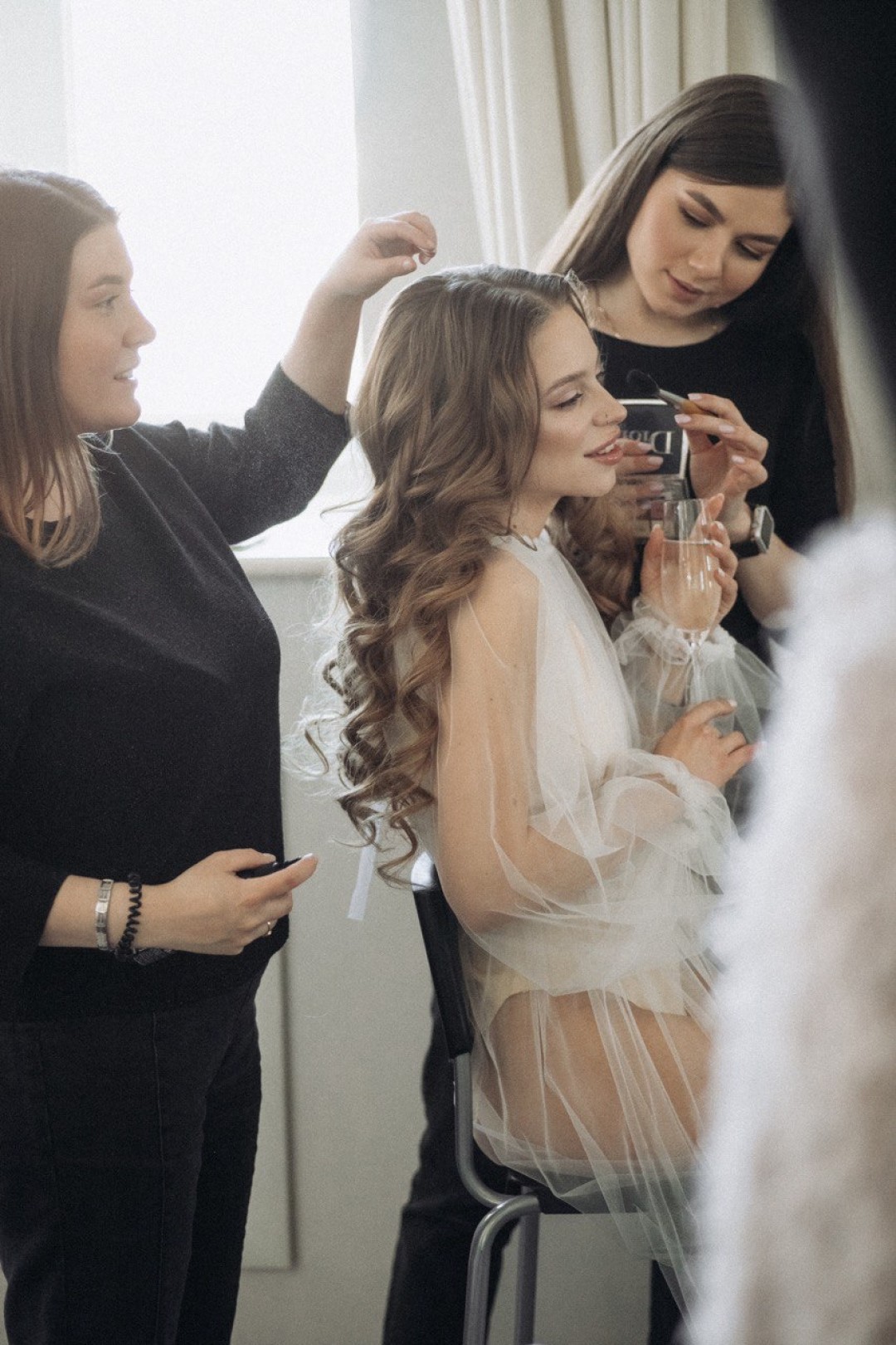На репетицию и на само создание образа лучше записываться заранее. Вы можете отталкиваться от даты, на которую назначена свадьба. В пик свадебного сезона (июнь–сентябрь) лучше записаться за 2-3 месяца, это даст гарантию, что в день торжества с вами будут именно те стилисты, к которым вы хотите попасть. В более спокойный период (октябрь–май) можно записаться за один месяц до свадьбы.