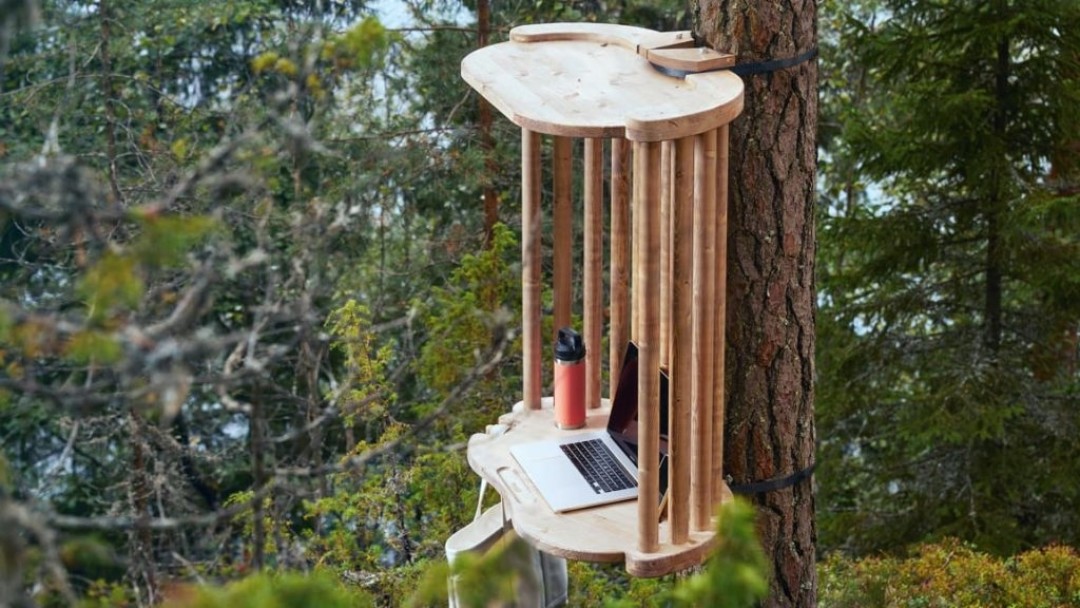 Креативное агентство TBWA\Helsinki и дизайнерская компания Upwood установили несколько рабочих мест под открытым небом в лесу для удаленных сотрудников в финском городе Лахти. Например, там есть рабочее место с видом на озеро Весиярви, в 45 минутах ходьбы от ближайшей автомобильной парковки.