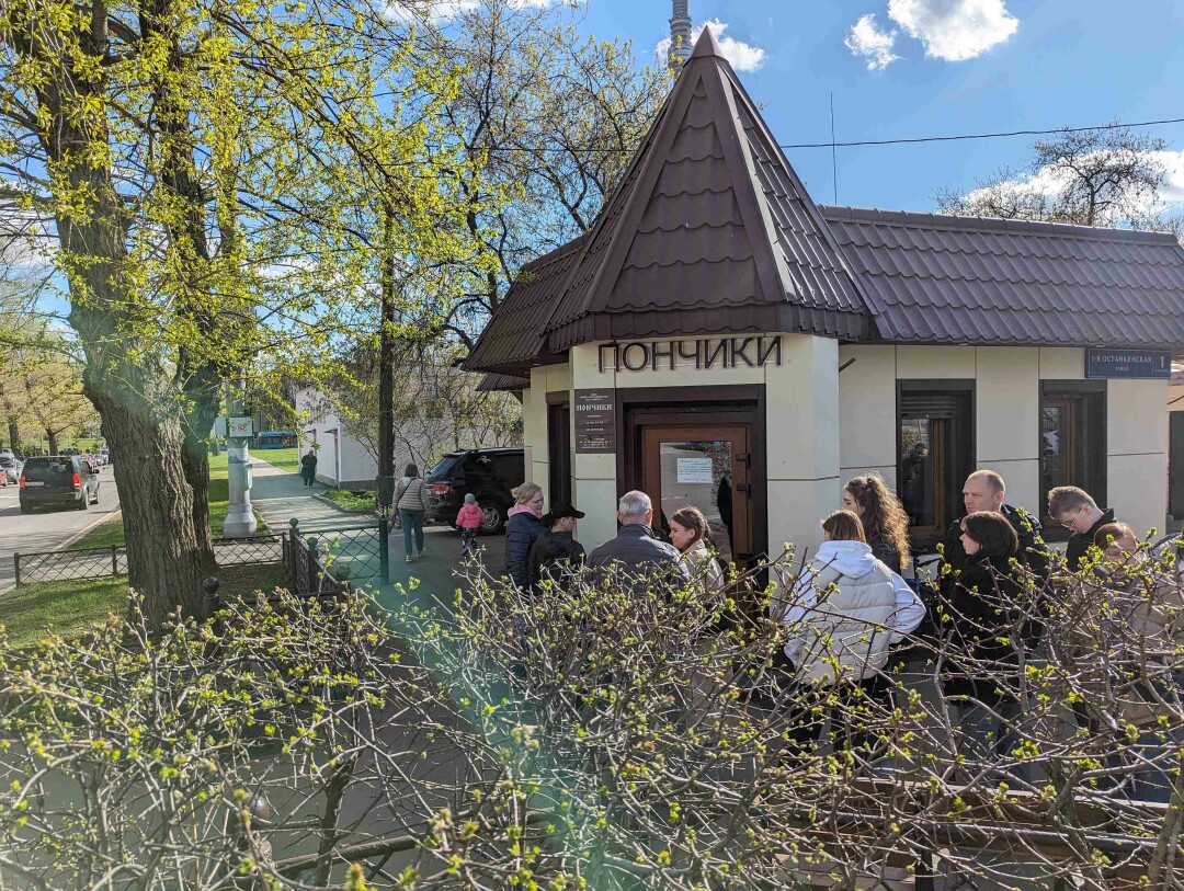 Легендарное заведение рядом с ВДНХ и одна из достопримечательностей. Здесь уже более полувека готовят пончики, за которыми в выходные приходится простоять больше получаса. Бесхитростный рецепт, отличное тесто, хрустящее снаружи, много пудры и стандартное окошко, через которое быстро выдают заказ. Эта еда стала чем-то вроде реликвии, многим не так важен вкус, как мимолетное прикосновение к истории. Из несладкого главные хиты меню — чебуреки и хот-доги.
