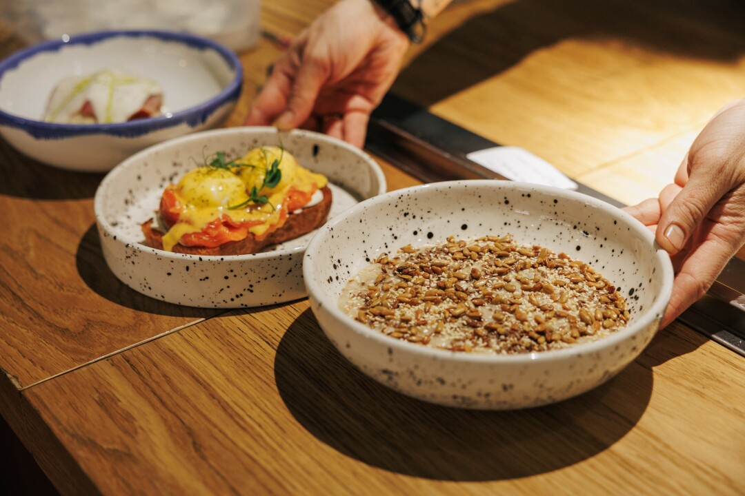 Ресторан №1 по продаже краба радует не только морепродуктами и японской кухней, но и отличными сытными завтраками. Они здесь с 08:45 до 16:00 по будням и с 10:00 до 16:00 по выходным. Приятное дополнение - это большая летняя веранда и красивый вид на набережную. Пробуем большой завтрак «Восток-Запад» №3 с креветками, авокадо, шпинатом, яйцами пашот, бурратой, соусом чимичурри, миксом семян и чиабаттой. Точно берем рисовую кашу на кокосовом молоке с манго и семенами чиа - очень вкусная и сытная. Из вкусного для настроения - нежные творожные пончики с начинкой из вареной сгущенки. Легкое и оригинальное дополнение к утреннему кофе.