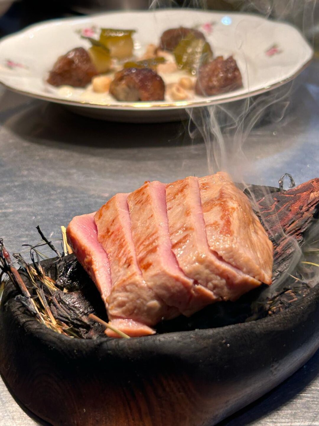 Блюдо подаем с соусом бешамель на основе черного чеснока и дополняем грушей, маринованной в еловом масле. Мясо проходит процесс ферментации в шио-коджи. Это расщепляет белки на аминокислоты и раскрывает потаенный вкус продукта. В финале коптим утку на сене и бересте.