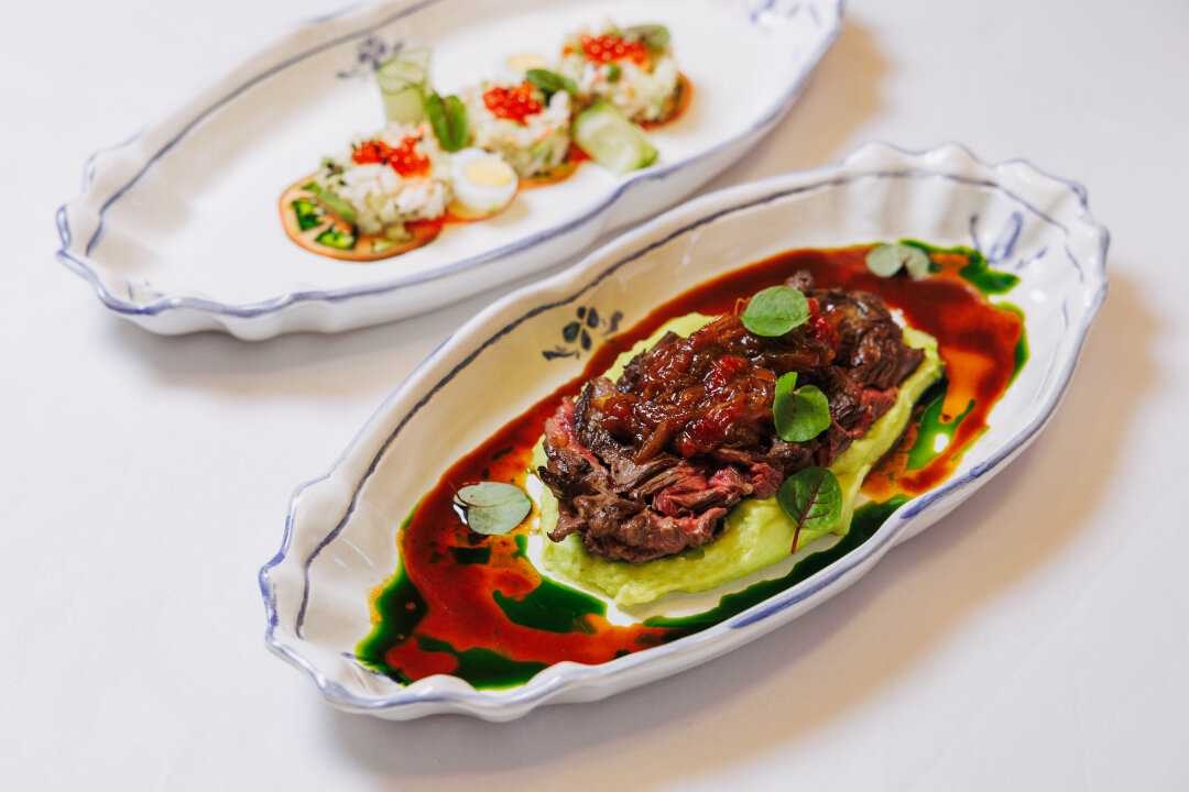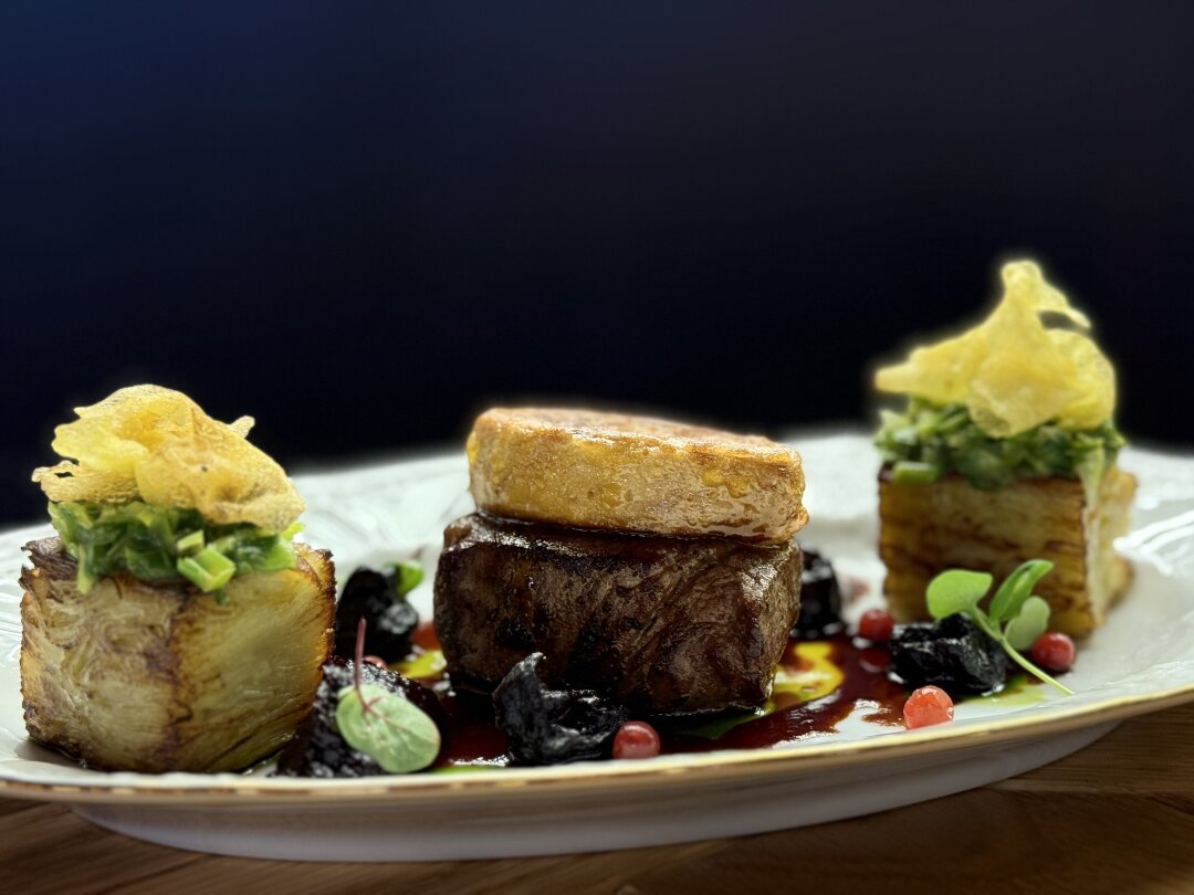 В основе — исторически известное блюдо французской кухни — Турнедо Россини (было создано в честь итальянского композитора!) Здесь сочный стейк миньон и нежнейшая фуа-гра с гратеном из картофеля. Мы дополнили позицию традициями русской кухни и добавили валяную свеклу, моченую бруснику и варенье из красного лука.