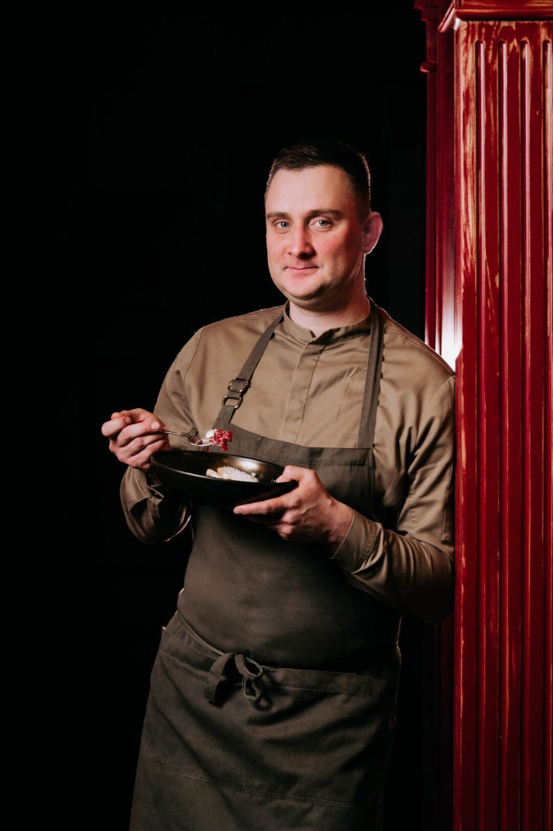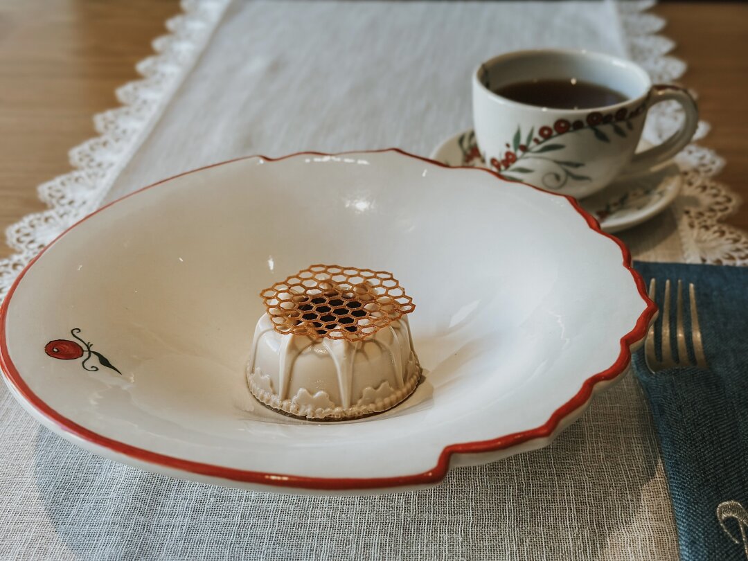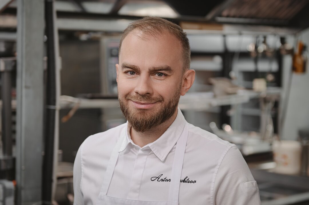 Десерт напоминает панакоту. Мы сохранили некоторые традиции исконного приготовления: в печи долго томим молоко, заготавливаем ряженку и уже создаем локальный продукт с современным подходом. Внизу — корж из печенья, подаем с соусом из вишни и корицы. Получается пряно, вкусно и легко.