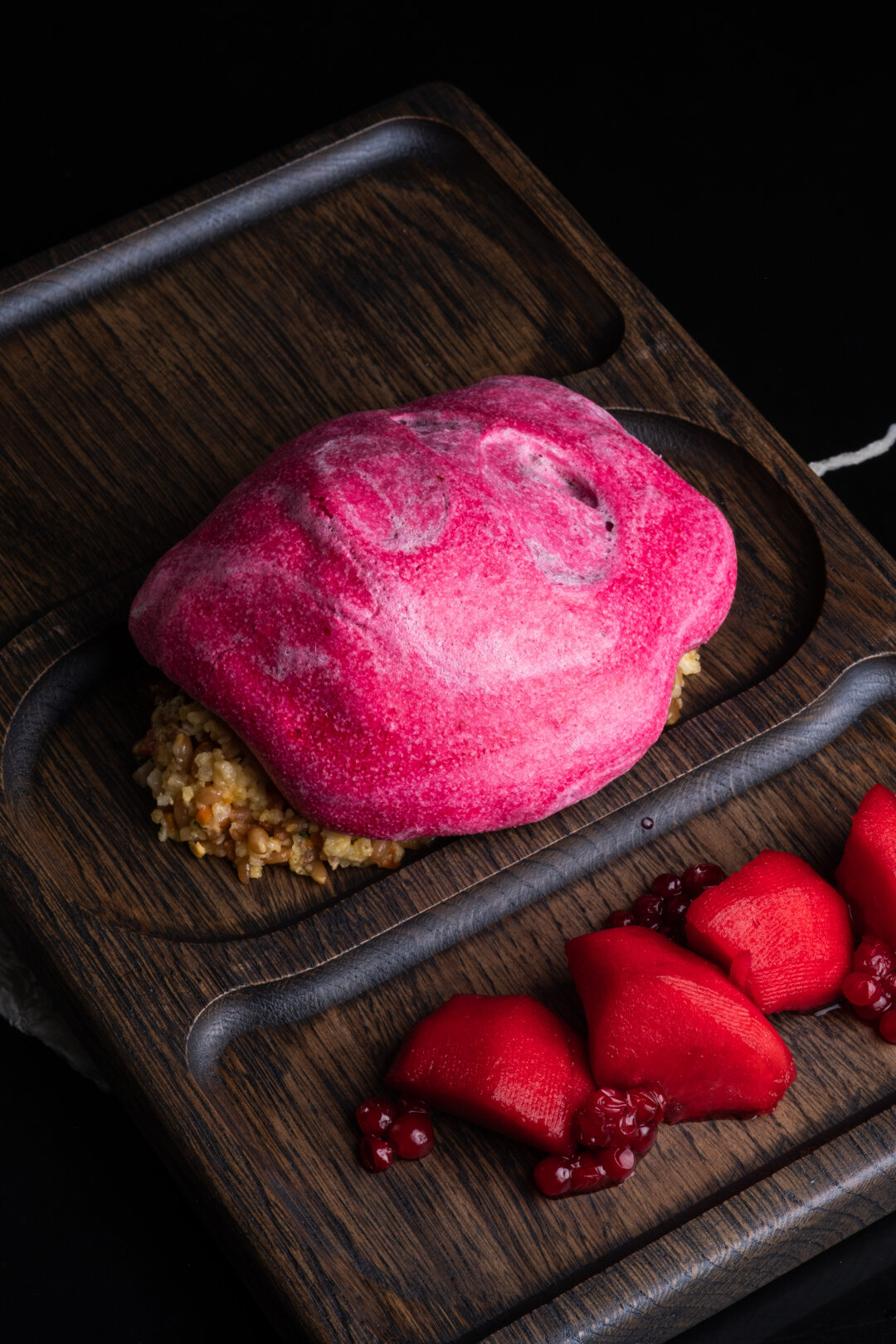 В области есть город Кологрив, где исторически останавливаются в период осенне-весенней миграции гуси. Птицу мы готовим по методу конфи — низкотемпературное томление в собственном жиру. Далее запекаем под панцирем из черной смородины. Блюдо подаем с кашей из злаковых с белыми грибами и подосиновиками, соусом демиглас, с мочеными яблоками и брусникой.