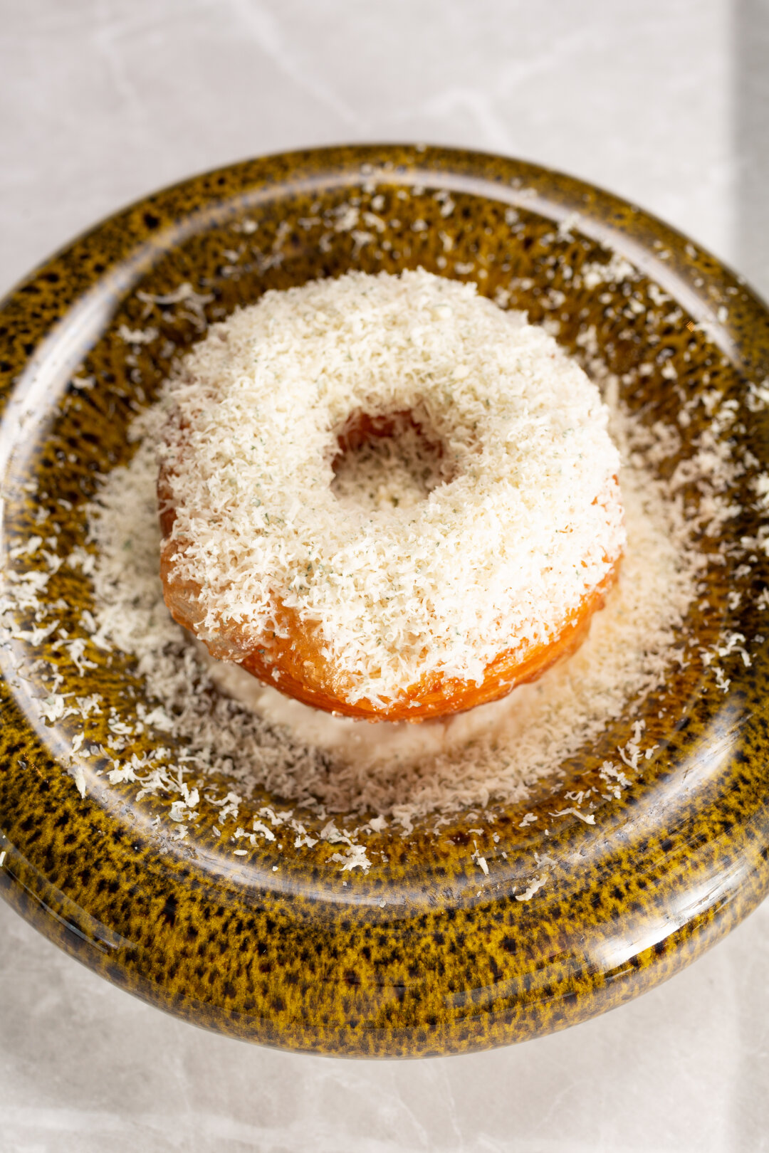 Пышка — десерт с многовековой историей, а первые упоминания относятся к славянским источникам. Название, вероятно, пришло из польского языка (pączek) или связано с русским глаголом «пыжить» — жарить в масле. Мы решили переосмыслить традиционный рецепт: воздушная основа сочетается с нежным сливочным кремом, пряной грушей и тертым замороженным сыром Дорблю.