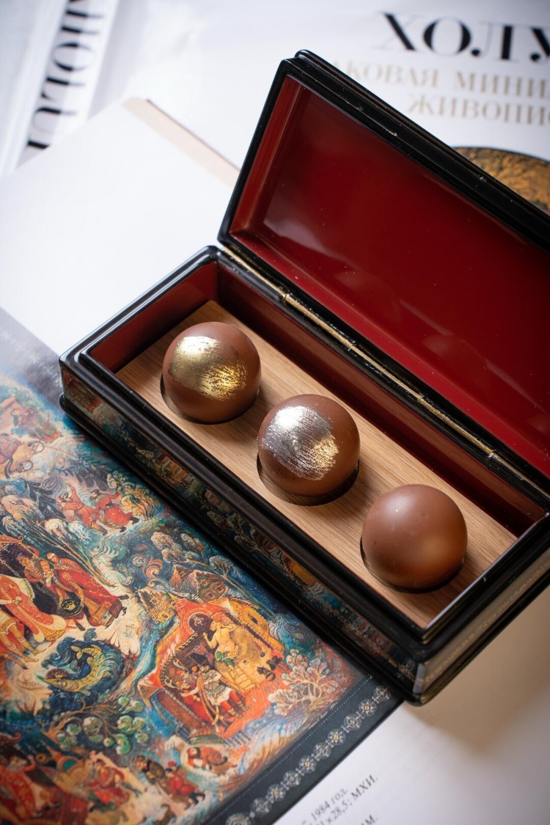 Настоящее гастрономическое сокровище ресторана: десерт ручной работы мы подаем в расписных шкатулках из знаменитого села Палех Ивановской области. Нежные конфеты с тающей текстурой скрывают жидкий центр — и каждая из них раскрывает яркий вкус в миниатюре.