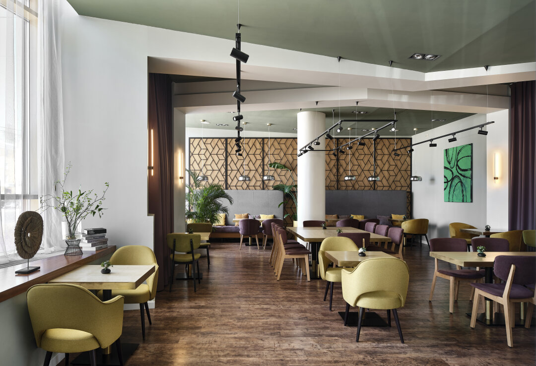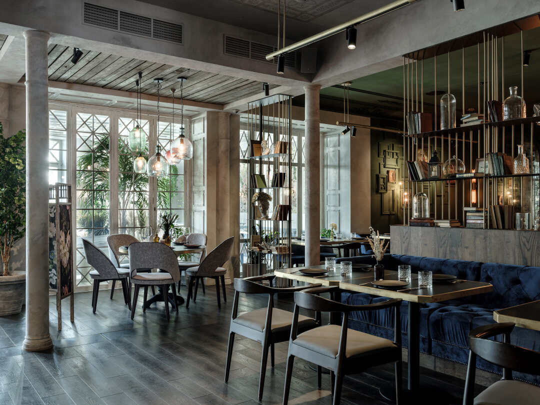 Интерьер ресторана на первом этаже пятизвездочного отеля выполнен в эклектичном стиле и гармонично сочетает главные тренды дизайна и винтажные акценты. Особое украшение — открытая кухня и меню, в котором собрана русская и европейская классика. Здесь сделали ставку на comfort food с фермерскими и локальными продуктами.