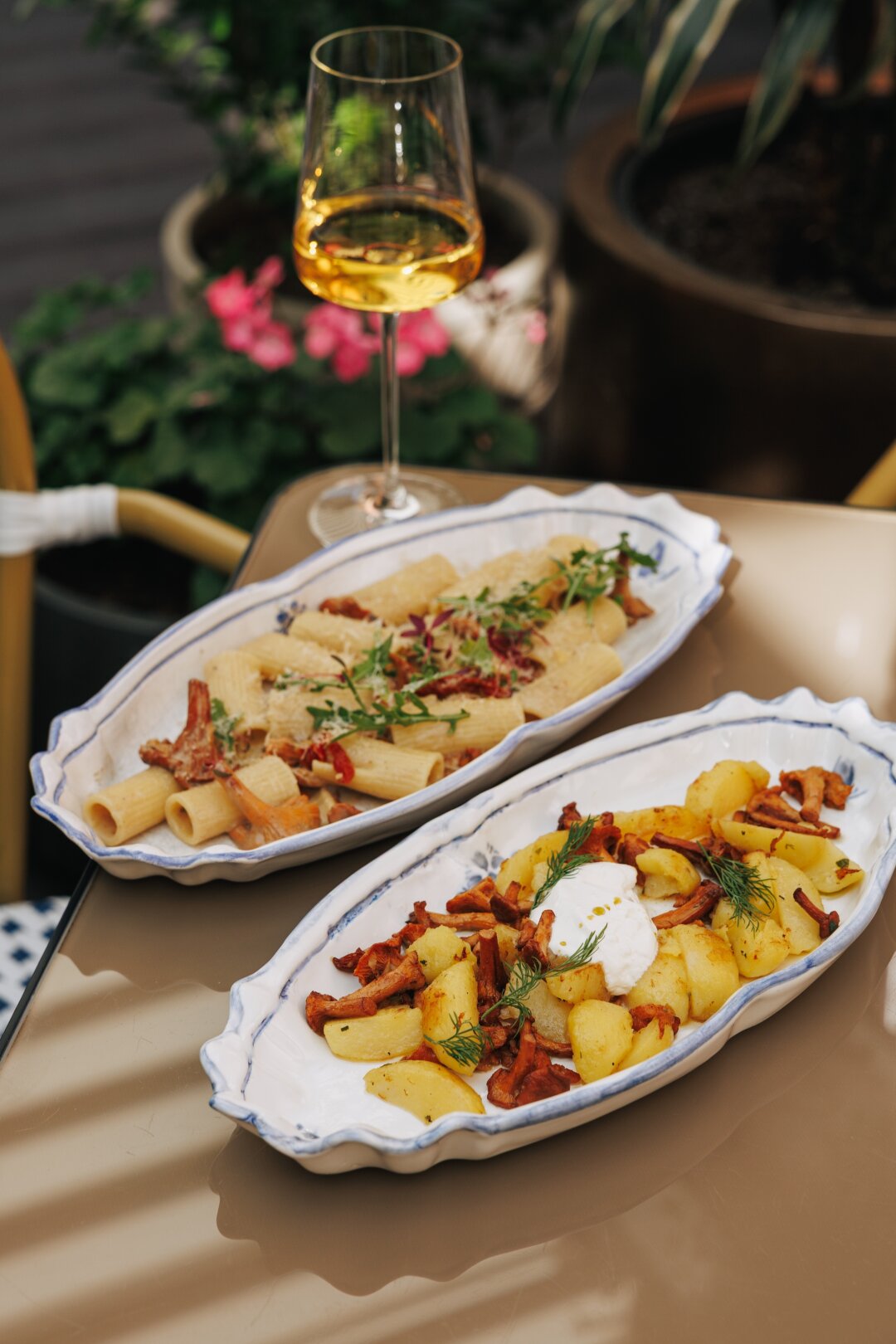 Ресторан французской кухни радует гурманов сразу двумя сезонными позициями. «Молодой картофель с лисичками и фермерской сметаной» — простое и любимое сочетание, которое благодаря мастерству поваров раскрывается по-новому. Блюдо выкладывают в тарелку, украшают кнелей сметаны, мелко резаным зеленым луком и сегментами укропа.Второе — «Паста с лисичками, вялеными томатами, пармезаном и трюфельным соусом». Баланс вкусов дополняет подача: руккола, вяленые томаты и тертый в крошку пармезан.