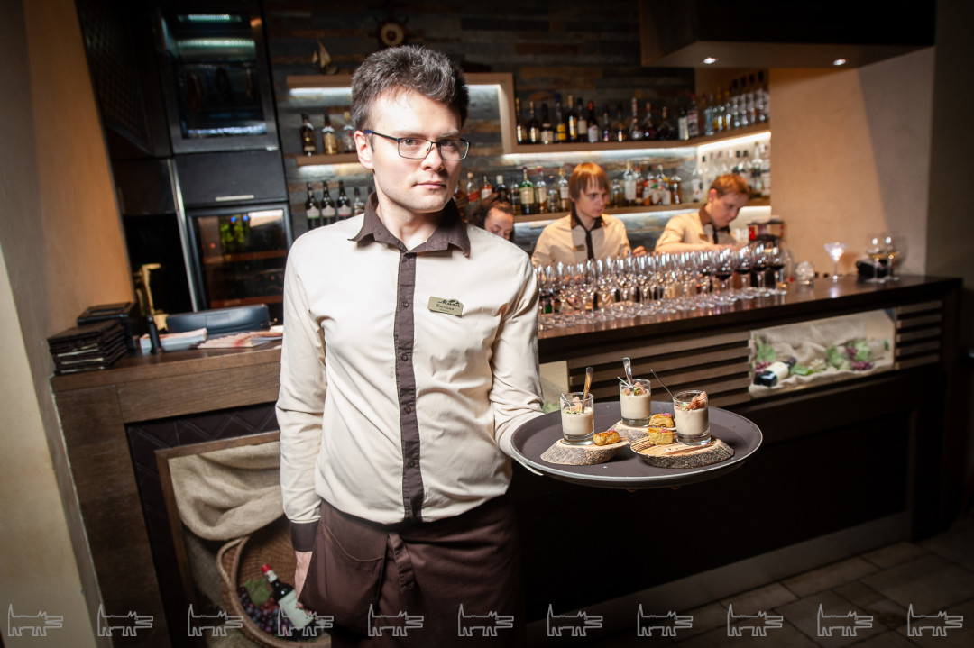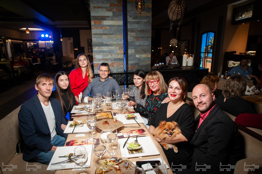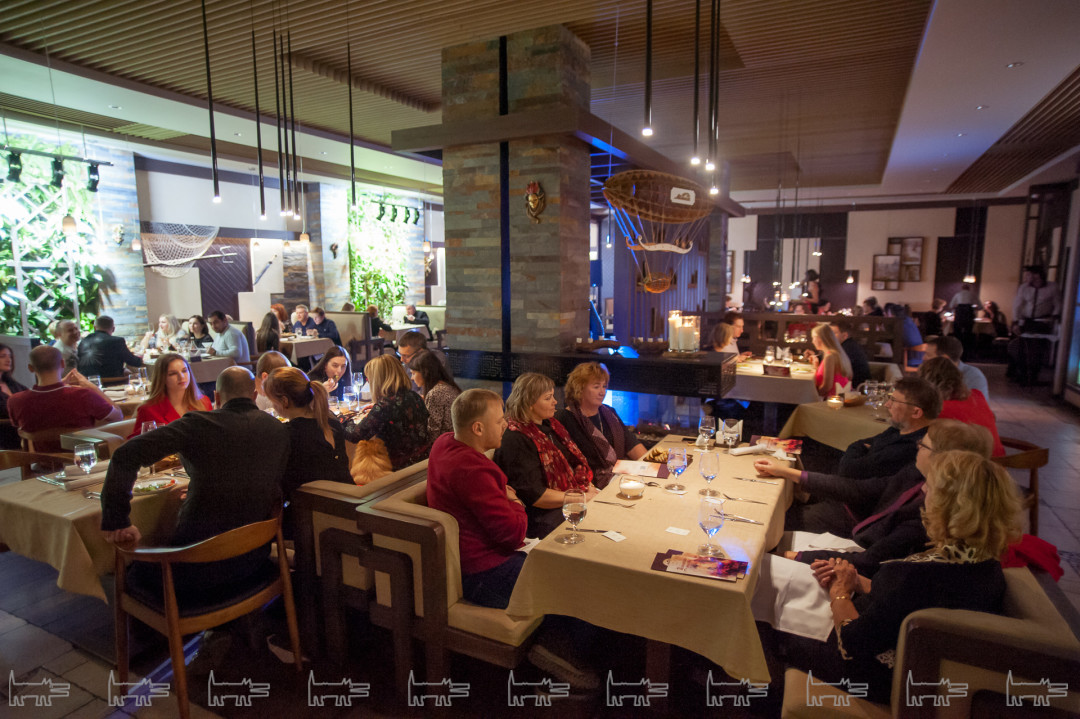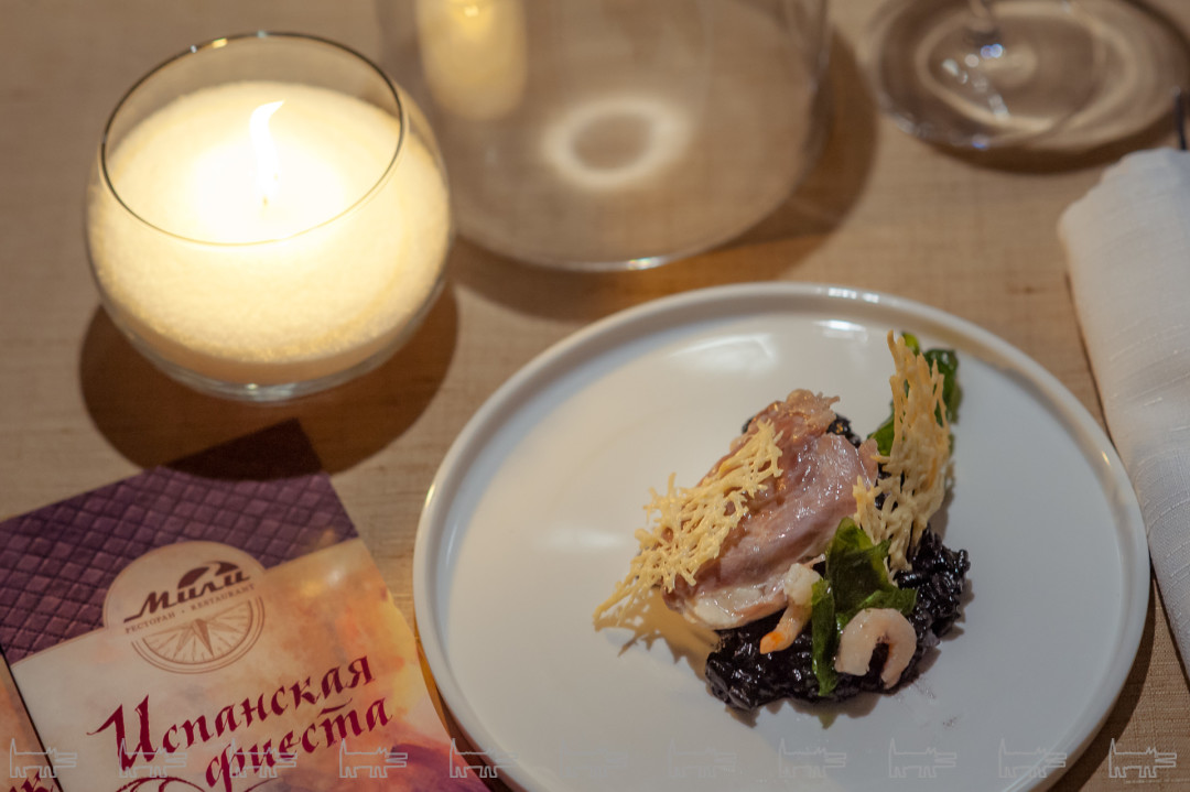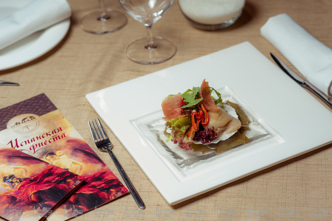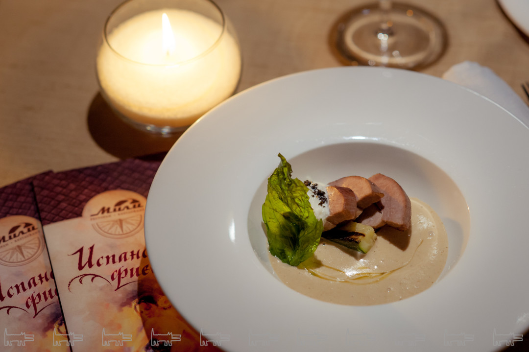 Началась дегустация с традиционной испанской закуски пинчос-бар с лососем, лангустинами, хамоном, анчоусами, вялеными томатами и козьим сыром. После – гости попробовали салаты с морским гребешком и кусочками мраморной говядины, шот с кремом из каштанов в качестве супа и поразивший всех сом в хамоне в качестве основного блюда. Завершением ужина стал божественный десерт Тинто - сочетание шоколадного мусса с конфи из красного вина на темном бисквите. Гастрономический вечер сопровождался специальными изысканными испанскими винами.