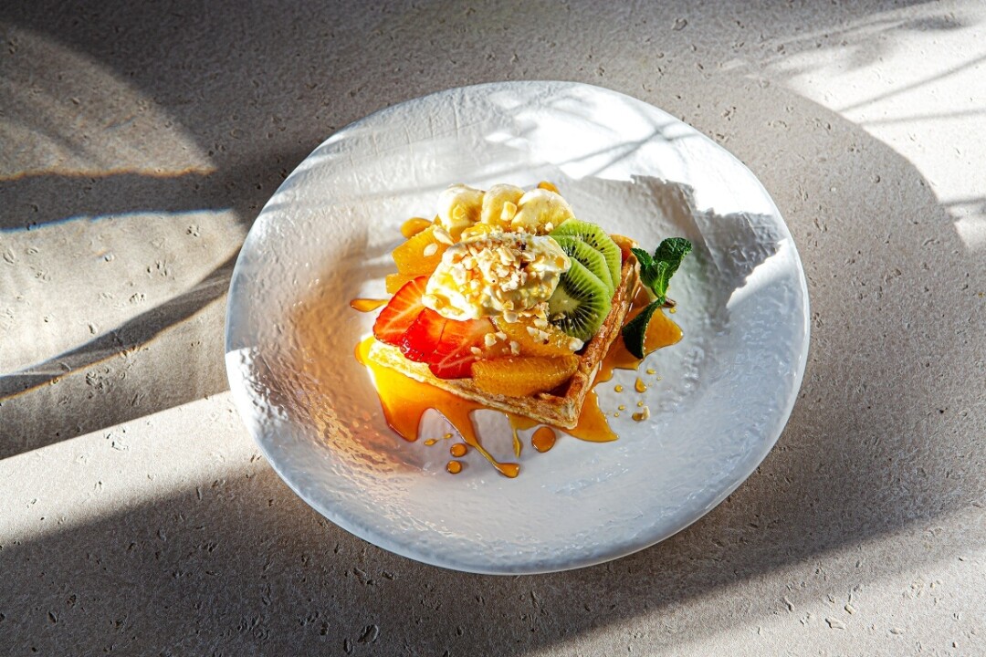 7. На готовую горячую вафлю распределите карамель, сверху красиво разложите фрукты и ягоды. В центр выложите кнелю из творожного крема (примерно 30 г), посыпьте молотым фундуком и сразу подавайте.