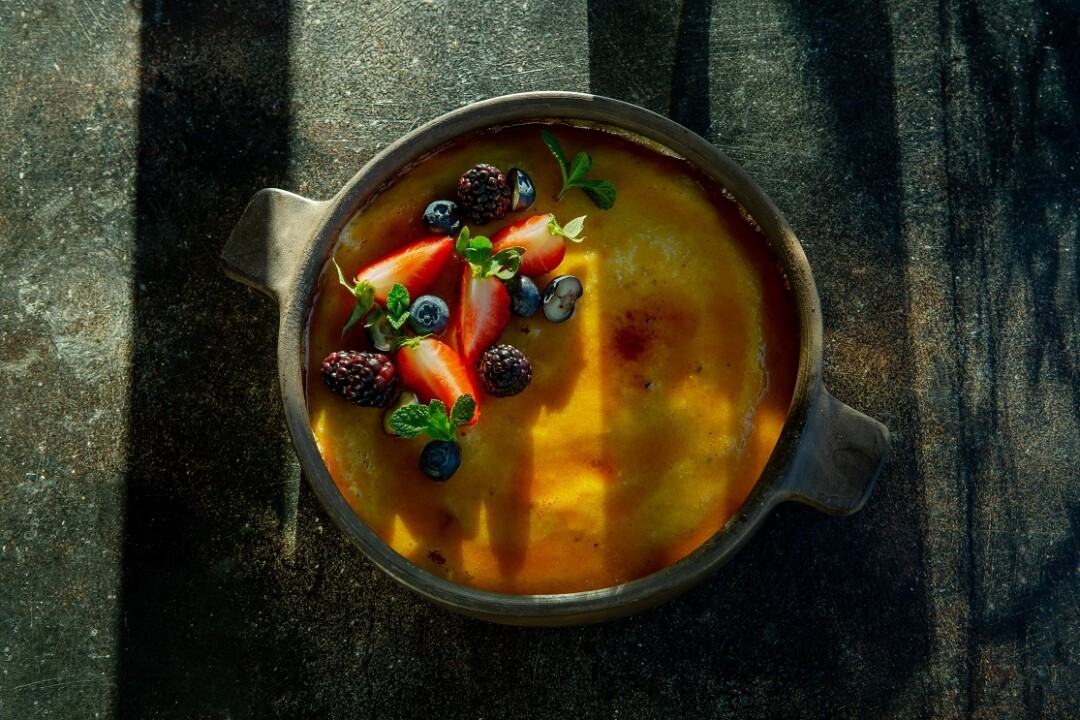 6. Готовую кашу посыпьте тростниковым сахаром и обожгите кулинарной горелкой, чтобы на поверхности образовалась карамельная корочка. Украсьте ягодами и сразу подавайте, пока каша не остыла.