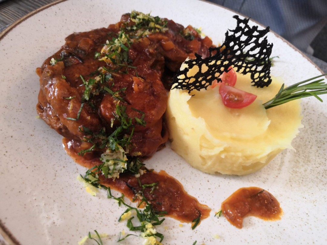 Оссобуко с гремолатой— это традиционное блюдо итальянской кухни из телятины на кости. Как говорит шеф-повар Grigio, итальянские мужчины редко доверяют готовить это блюдо женщинам, поэтому сами встают к плите и следят, чтобы мясо таяло во рту.