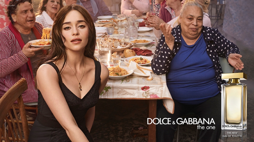 Актриса Эмилия Кларк, известная по роли Дейенерис Таргариен из сериала «Игра Престолов», стала амбассадором парфюма Dolce & Gabbana «The One». В новом видео-кампейне бренда «Мать драконов» гуляет по шумным итальянским улицам, танцует с официантом и ест пасту, причмокивая «Bellissimo!». В качестве заглавного фото рекламы, которая вскоре появится в мировых глянцевых изданиях, был выбран сюжет с застольем и удивленной итальянской бабушкой «в теле», на фоне которой Кларк позирует в привычном сексуальном амплуа.