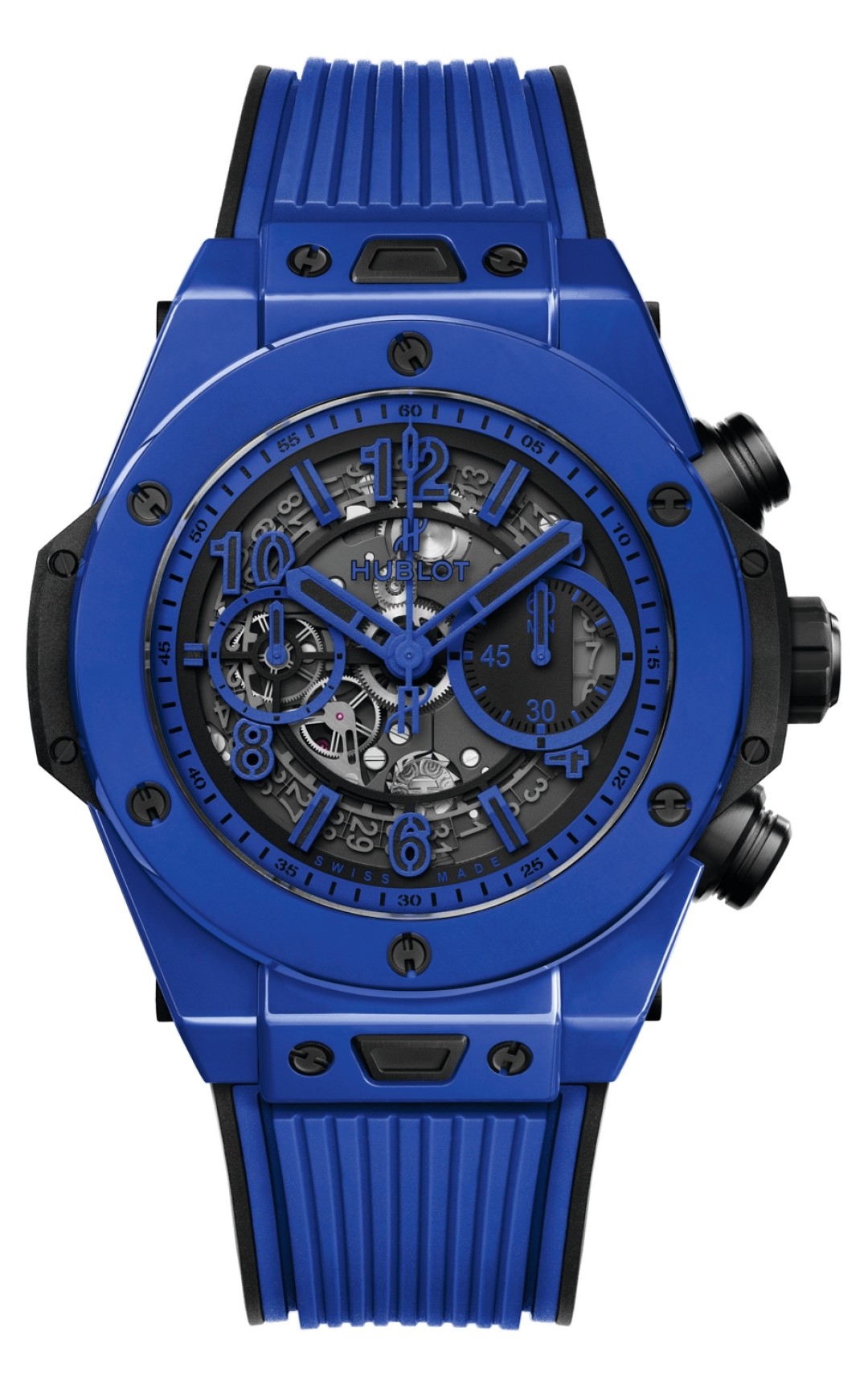 Новая победа специалистов отдела исследований и развития швейцарской мануфактуры: 45-миллиметровому корпусу и безелю из высокотехнологичной керамики удалось придать ультрамариновый цвет, который оттеняет черные детали открытого механизма флайбек-хронографа.