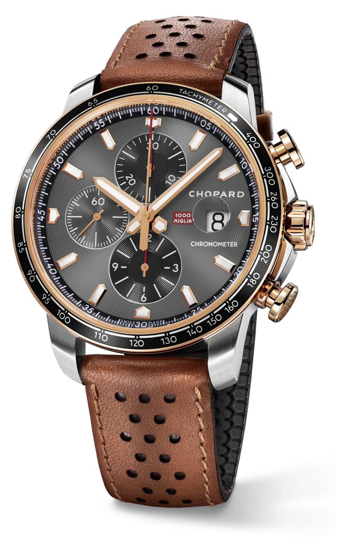 Гонка «Тысяча миль» от Брешии до Рима и обратно на ретромобилях уже 31 год проходит при поддержке Chopard. В 2019-м альянс празднуют лимитированной серией из 250 часов. Тахиметрическая шкала позволит рассчитать средний темп, а куража знатокам придаст подкладка ремешка в виде протектора шин Dunlop 1960-х годов.
