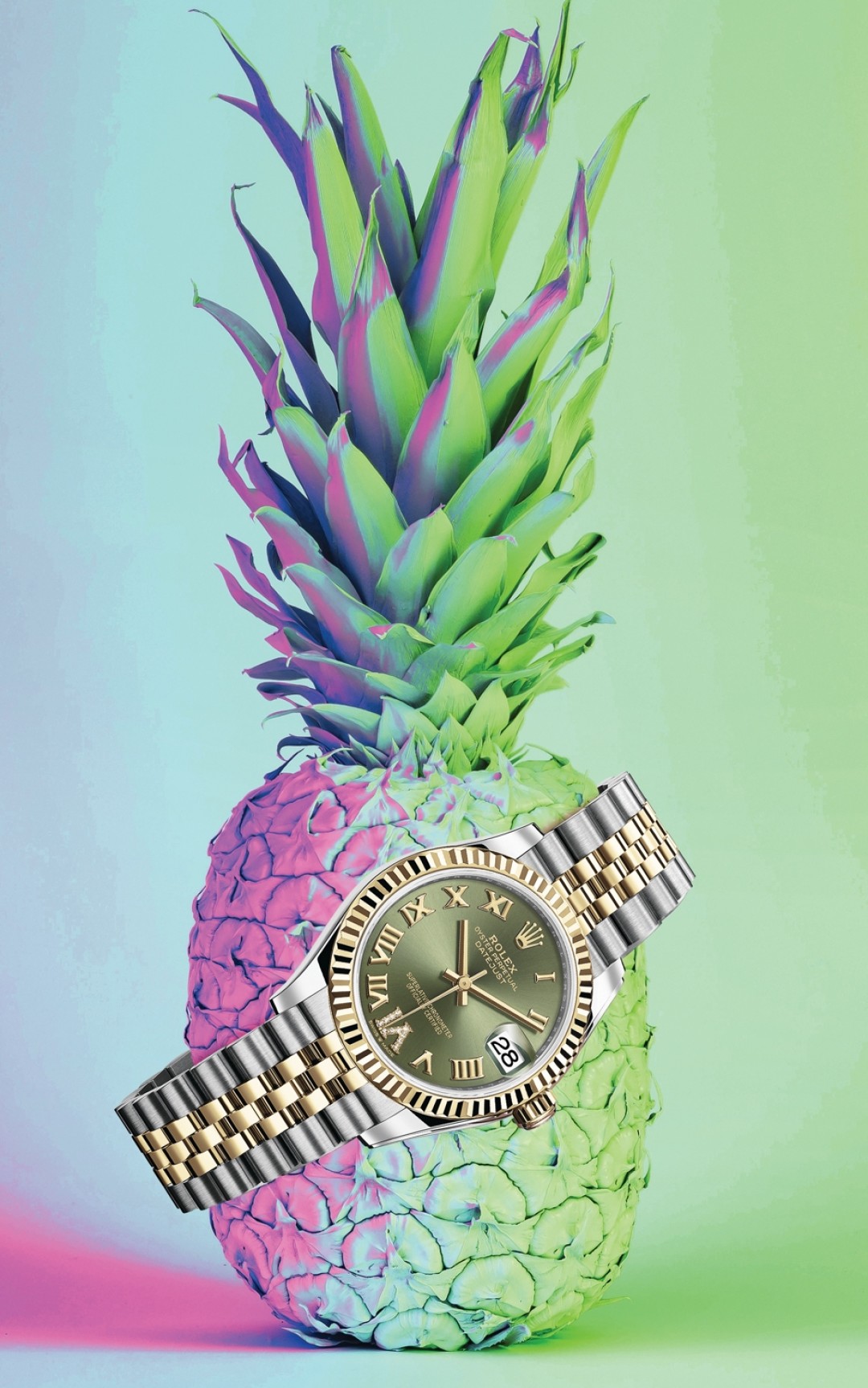 На новых часах от Rolex надето целых пять атрибутов самодержца: в положении «12 часов», на внутреннем ободке рифленого безеля из желтого золота, на заводной головке, на застежке браслета и под инкрустированной бриллиантами римской цифрой VI. Швейцарская мануфактура имеет право на царские причуды, и это подтверждено документально: именно Rolex придумали в 1933-м миксовать желтое золото с прочной сталью, а в 1945-м запатентовали Datejust как первый наручный водонепроницаемый автоматический хронометр. Надежность часам гарантирует привинчиваемая задняя крышка — микроключ к ней есть только у мастеров Rolex.