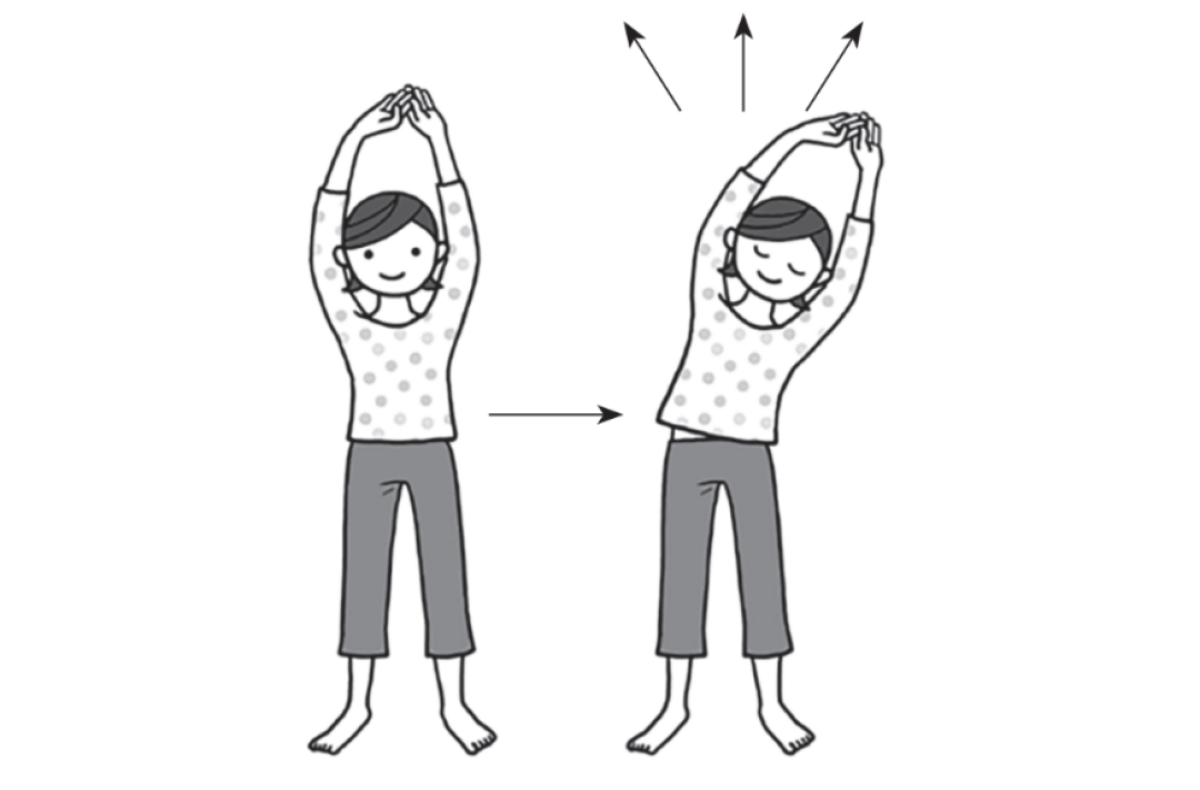 - Поднимите обе руки вверх, затем левой рукой захватите как можно дальше пальцы правой руки.