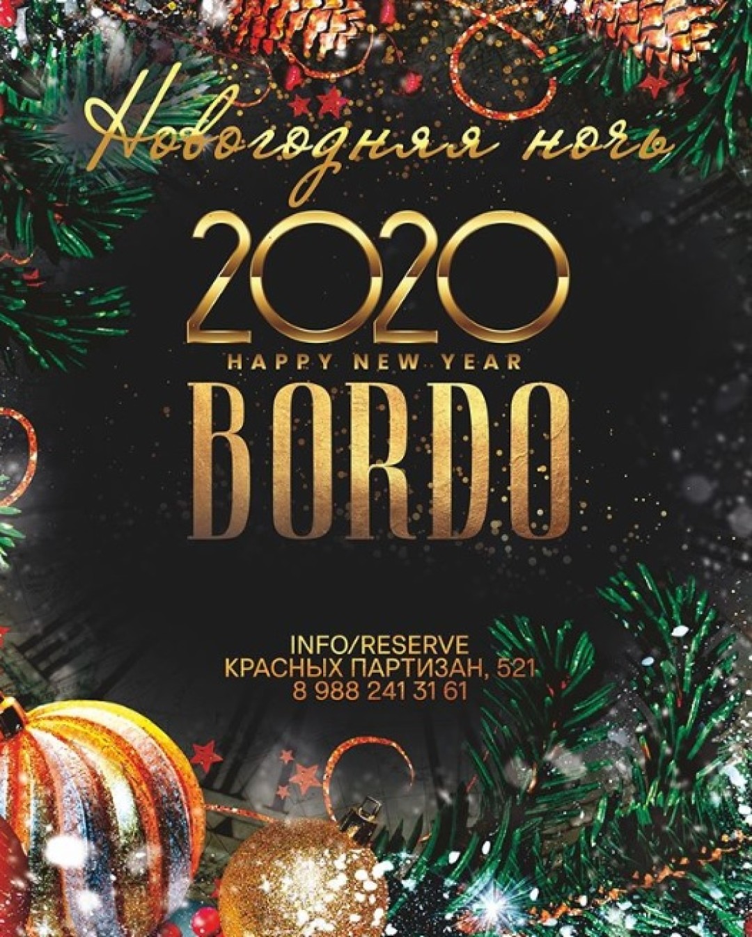 В новогоднюю ночь в VIP караоке-холле «BORDO» преобразится в блистательное кабаре, где будет царить атмосфера праздничного веселья с танцами и артистическими номерами. На сцене выступят артисты, кавер-исполнители с яркими композициями, идеальными для исполнения новогоднего канкана. Дед Мороз и Снегурочка тоже придут на «огонек»! Это ночь принесет вам массу положительных эмоций!
