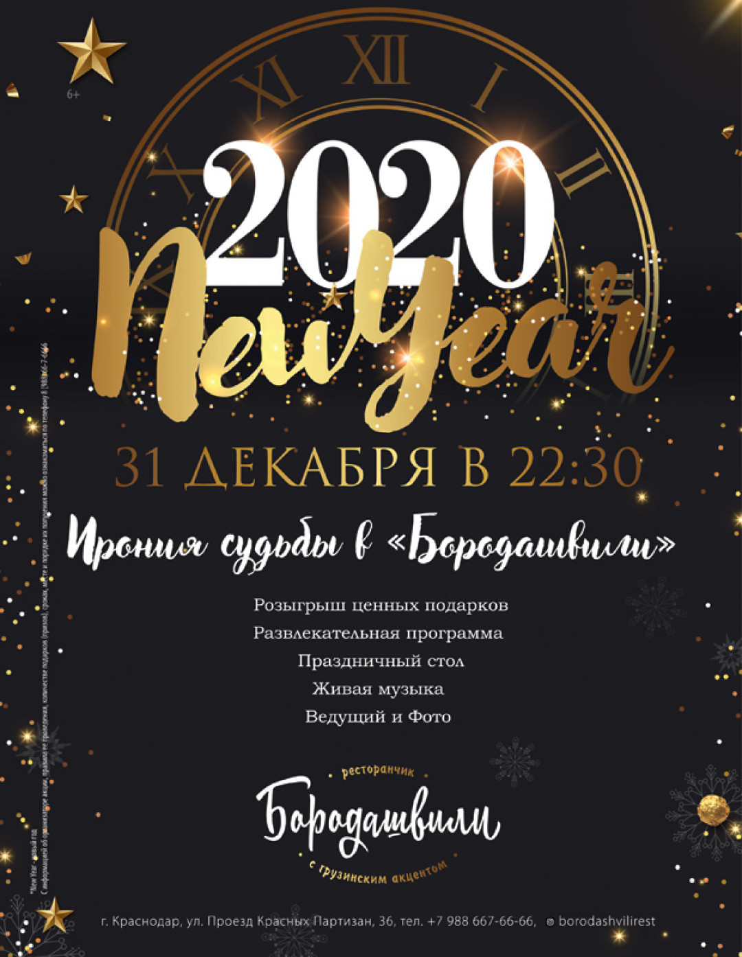 В «Бородашвили» Старшем, как всегда, ничего лишнего: только вкуснейшая национальная еда, обильные и щедрые застолья, гостеприимство в лучших грузинских традициях, душевная атмосфера и радушный прием. И это лучшая программа для главной ночи: ведь Новый год нужно встречать в тепле и уюте, сытым и счастливым! В программе ночи: розыгрыш ценных подарков, живая музыка, развлекательная программа, фотограф, который сделает профессиональные снимки на долгую память.
