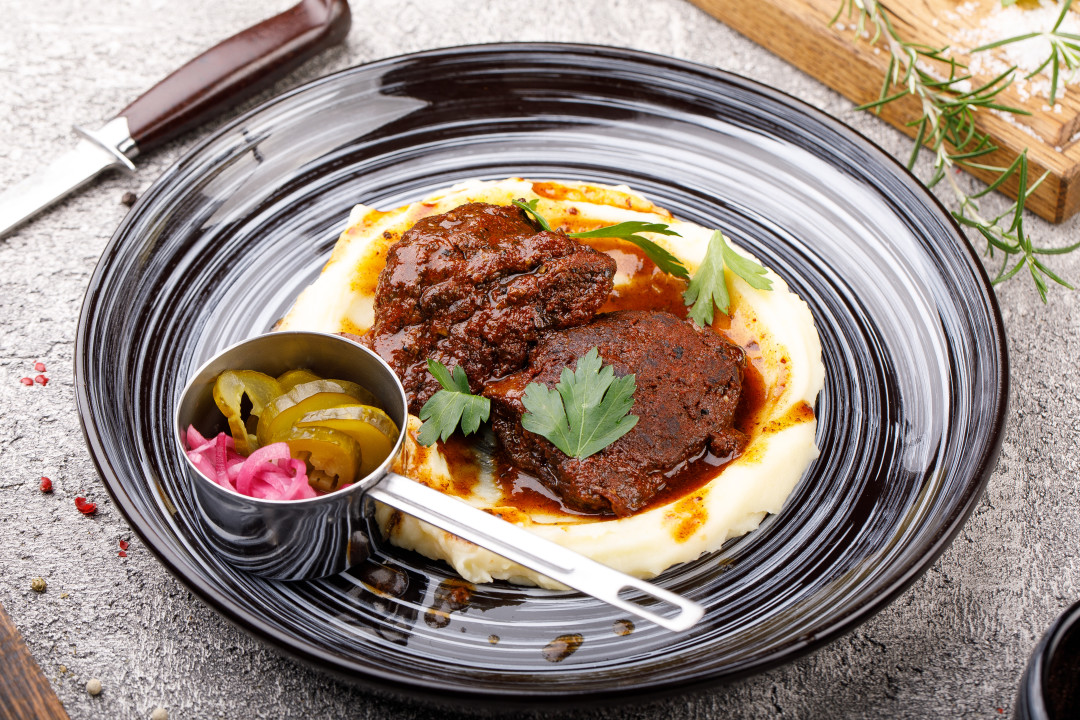 Еще одно блюдо, достойное вашего внимания - говяжьи щечки с картофельным пюре и острыми огурцами.