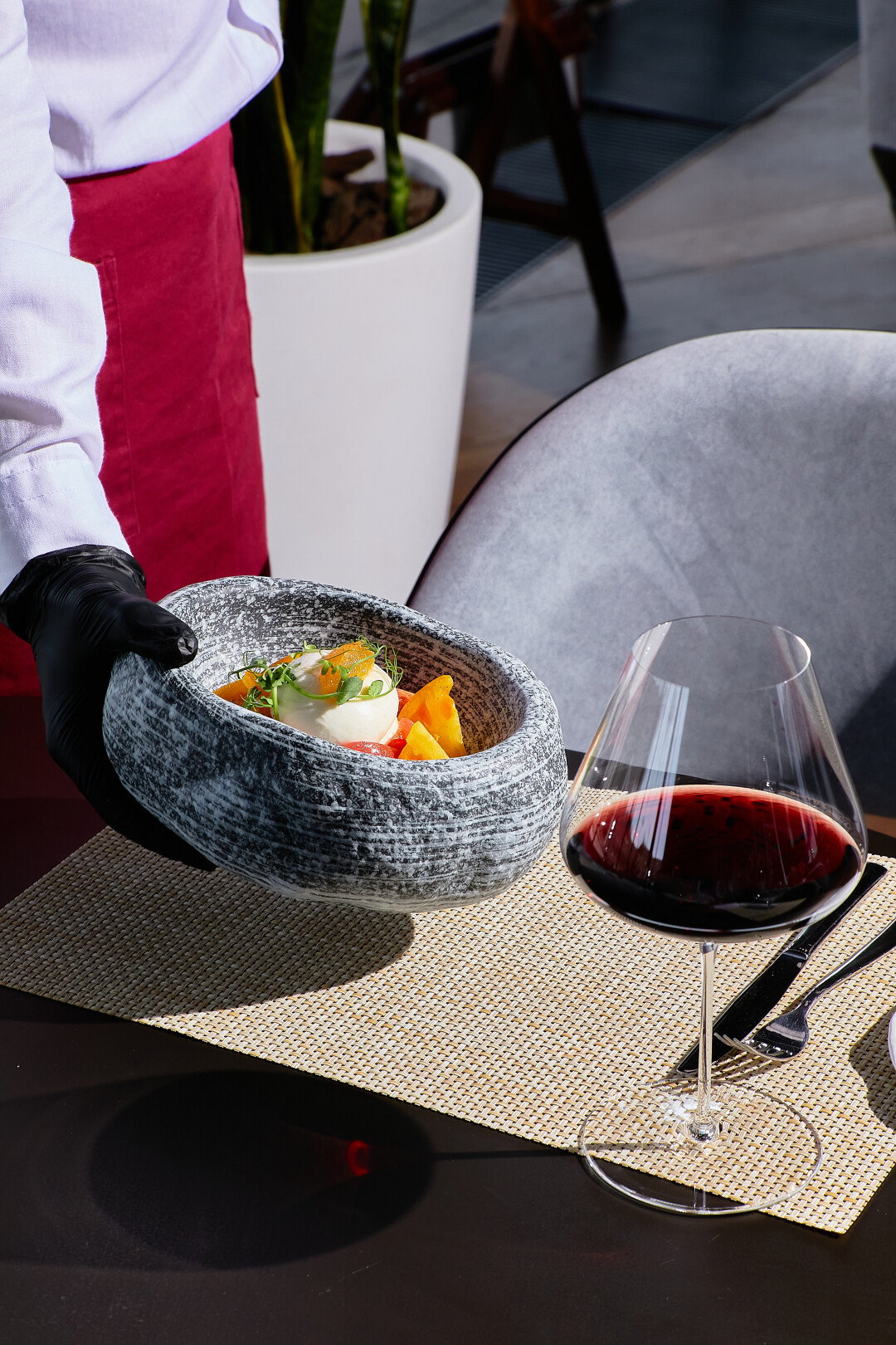 Меню ресторана примечательно концепцией, которая отражает идею самого парка: все локальные продукты достойны признания и оттого приготовлены здесь с особенной любовью. Сезонные блюда однозначно допускаются к дегустации первыми: карпаччо из свежих крымских томатов с соусом из трав, севиче из черноморского горбыля с цитрусовым соусом и зернами граната, зеленый гаспачо с тартаром из креветки и свежего огурца, глосик азовский жаренный с овощами и молодым картофелем.