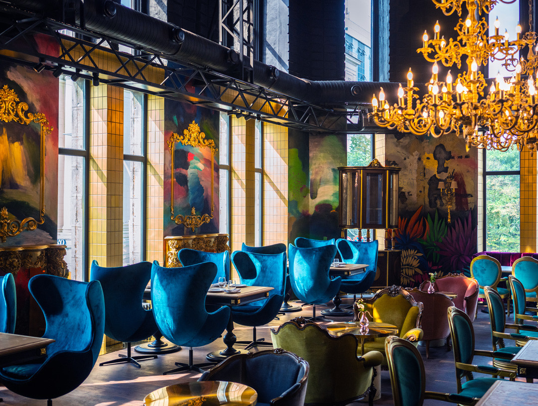 Акценты в интерьере сделаны на контрастные цвета стен, мебели, аксессуаров, обилие зеркал и света. Соседство в пространстве прожекторов и ферм с антикварной мебелью и массивными люстрами создает то самое сочетание богемии и современной культуры. Что касается кухни, в меню можно встретить как классические европейские, паназиатские блюда, так и авторские творения бренд-шефа Дениса Крупени.