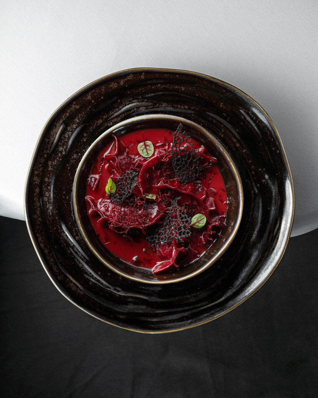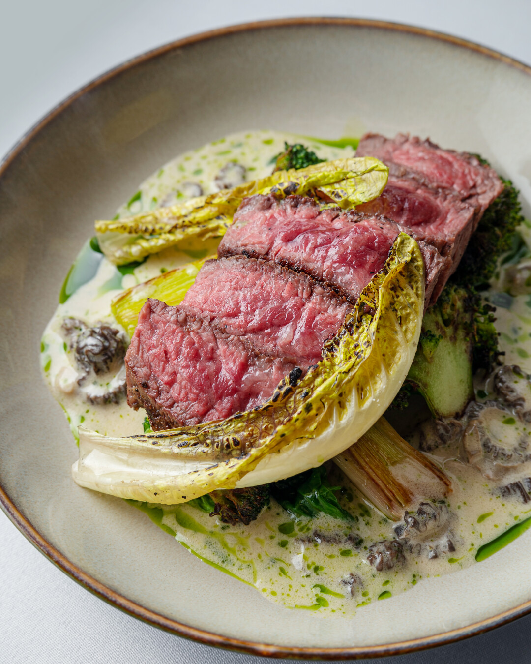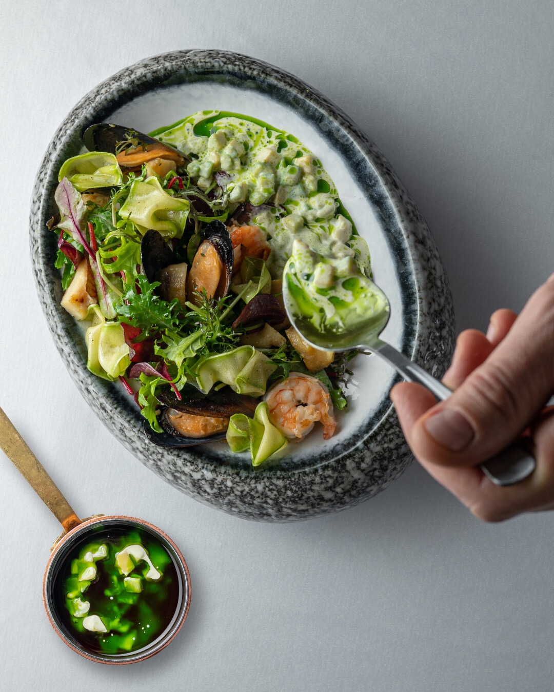 Продолжаем ресерч опять-таки санкционными редкостями. В категории холодных закусок тяжело удержаться от дегустации хамона иберико себа (24 месяца) с грушей, рукколой и сегментами камамбера. Стейк-салат из мраморной говядины с печеным баклажаном и сулугуни закроет сразу два гештальта: во‑первых, вкусите нежнейший мясной деликатес, а во‑вторых, запрос на сезонность и кавказскость будет удовлетворен. Несмотря на то, что мы с вами проживаем в субтропическом климате, весна выдалась не то чтобы очень жаркой, поэтому согревающие первые блюда пока не вышли из поля актуальности, например, крем-суп из топинамбура с копченым сомом или сливочная уха с печеным палтусом и форелью.