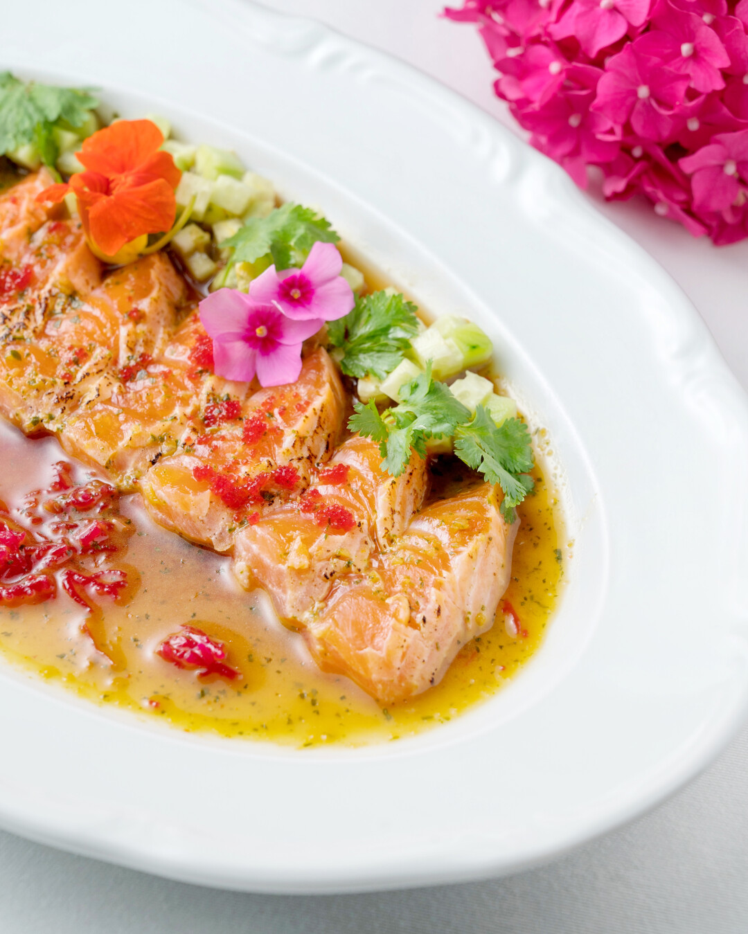 Начнем, пожалуй, с перемены цветового настроения. Второй этаж ресторана — локация, откуда открываются безрубежные виды на море, оттого площадка стала излюбленным местом для проведения выездных церемоний и свадебных торжеств. В сезоне-2022 декораторы ресторана решили оттенить главную достопримечательность (море) подходящим цветовым решением. Пастельная палитра контрастирует с морской панорамой и позволяет гостям насладиться видами не только из ресторана, но и в самом заведении. Мебель, декор и в особенности освещение талантливо встроились в пространство и, не перетягивая внимание на себя, создают цельную визуальную гармонию. В общем, дизайнеры постарались на славу, дело за гастрономией.