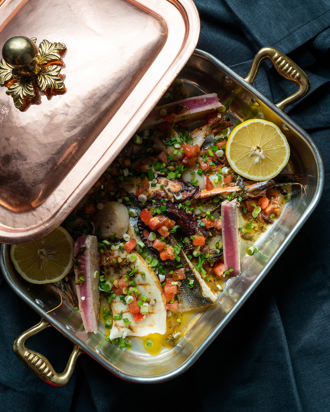 Есть еще одна особенность, которая переворачивает с ног на голову привычный гастрономический вектор. Вы можете стать соавтором идеи своего будущего блюда. Шеф воссоздаст для вас вкус любой страны или кухни. Крупный сахалинский гребешок, морской еж, кальмар командорский, устрицы всех морей и океанов, креветки, камчатский краб, вонголе, спизула, мидии, сибас, дорадо и тунец — любое блюдо и подача, стоит только пофантазировать.