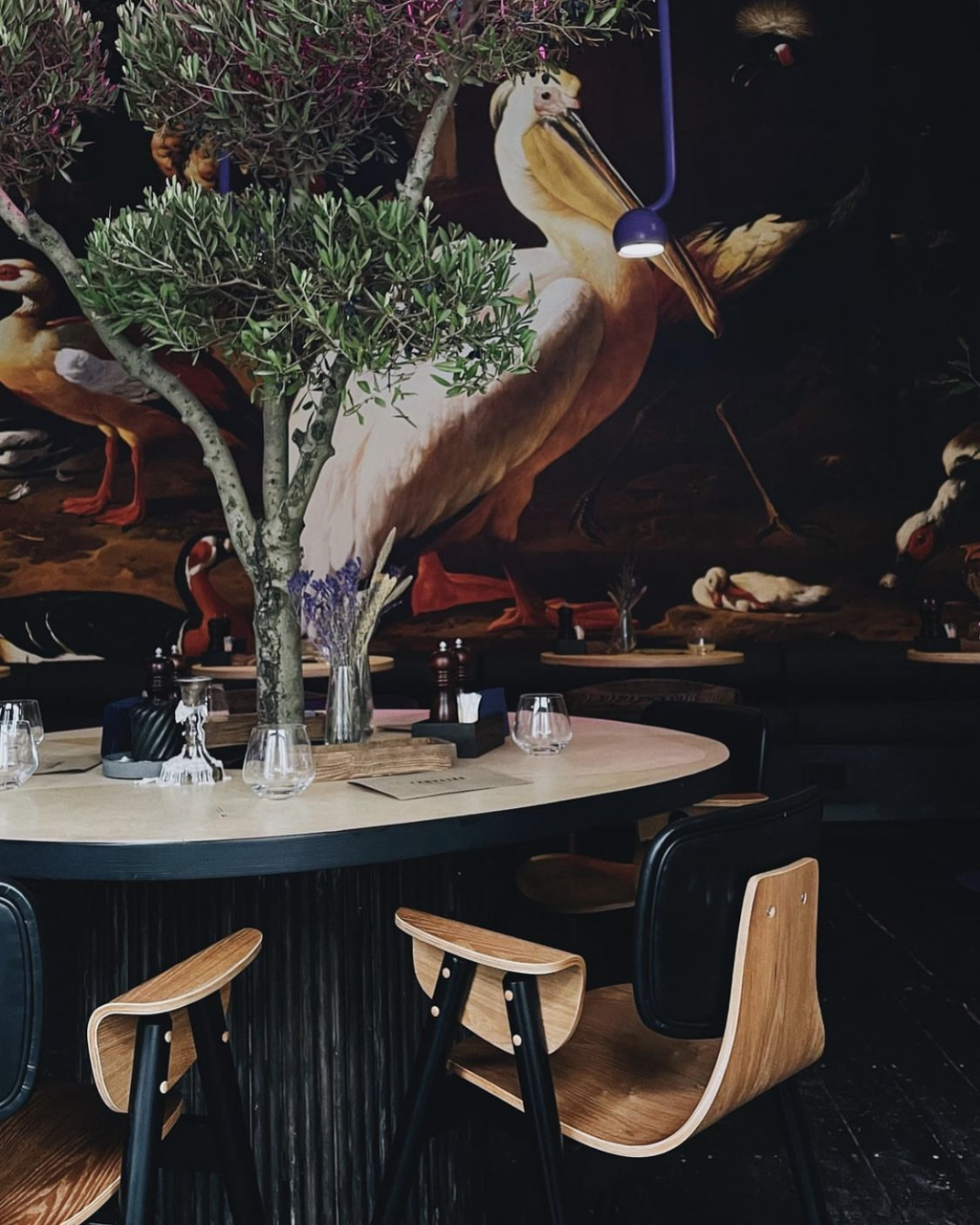 Интерьер на контрастах: монументальную классику (наливной пол, фактурные живые стены и арки, брутальный бар, большие оконные проемы) дизайнер Елена Ткач умело смиксовала с вирусными, цепляющими глаз и прямиком попадающими в инстаграм элементами (цветными полупрозрачными панелями из полимера в модном неоновом оттенке, яркими футуристичными светильниками и огромной репродукцией картины голландского художника Мельхиора де Хондекутера «Птицы в парке»).