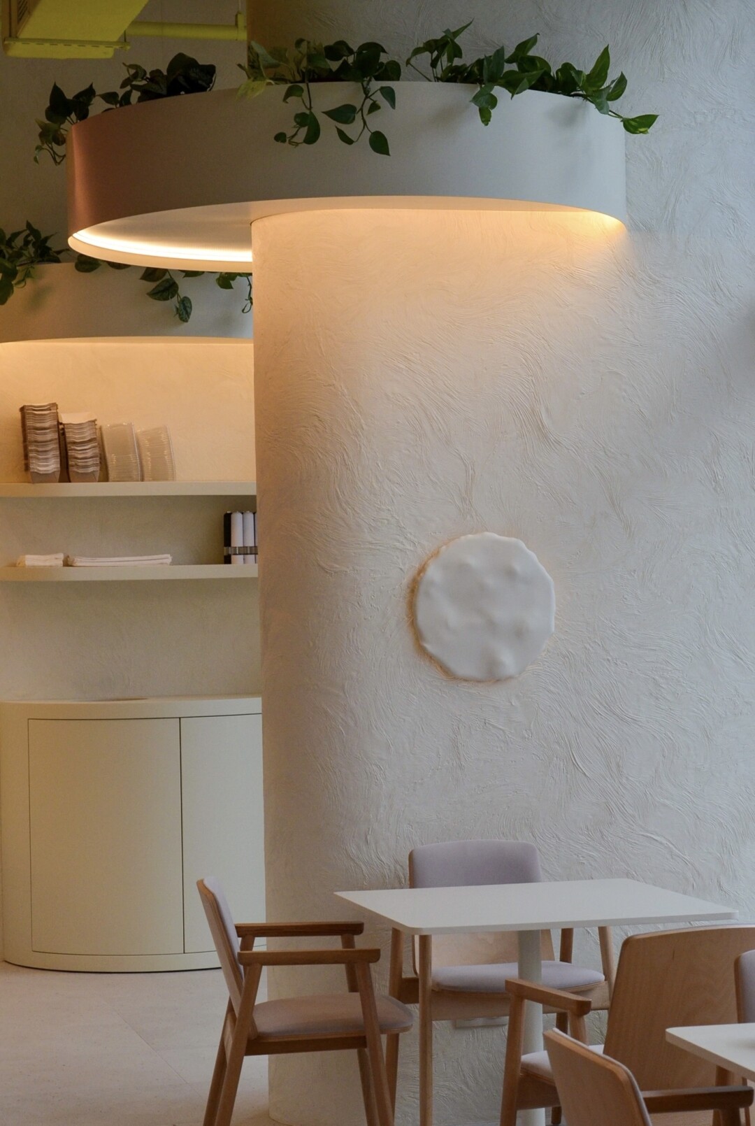 Ответственные за интерьер круассантерии, как всегда, команда Vandall бюро — Вова Анд и Оля Хаматгалиева. Они оставили проект узнаваемым, при этом сделав его не похожим на первые два. В интерьере много воздуха, он стильный, минималистичный и при этом символичный. Узор на стенах повторяет рисунок, появляющийся на поверхности теста при заготовке, с которым так много работает команда. Светильники и стулья с неидеальными поверхностями — тоже отсылка к ручному труду и к особенностям подхода. Тут стремятся создавать наполненный теплом и любовью натуральный продукт. Это не про идеальную симметрию. Конечно, не обошлось и без ярких акцентов в фирменных оттенках: стойки, футуристичные светильники, яркие полки над барной стойкой.