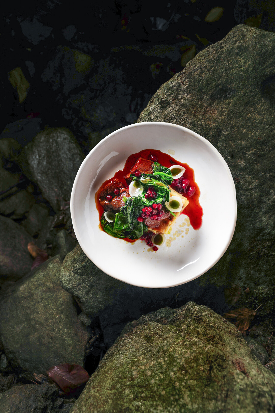 В летнем меню ресторана параллельно с новинками стартовал сморчковый сезон. Шеф-повар поместил местные грибы практически в каждую категорию. Первым курсом дегустируем закуски — мини-эклеры со сморчками — и плавно переходим к салатам. Здесь шеф предлагает попробовать совершенно необычный микс: сморчки, молодой папоротник и кедровый орех. Если бы существовала необходимость выразить суть Красной Поляны в гастрономическом эквиваленте, то блюдо из ресторана Red Fox подошло бы идеально.