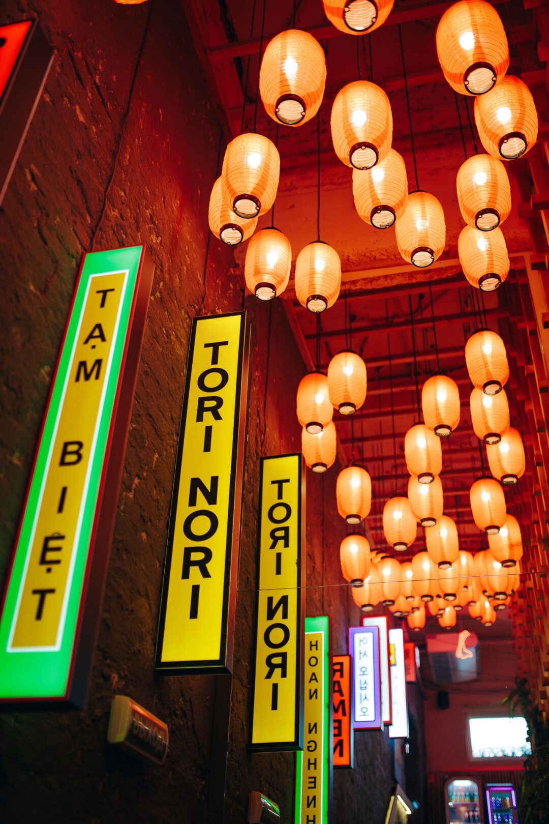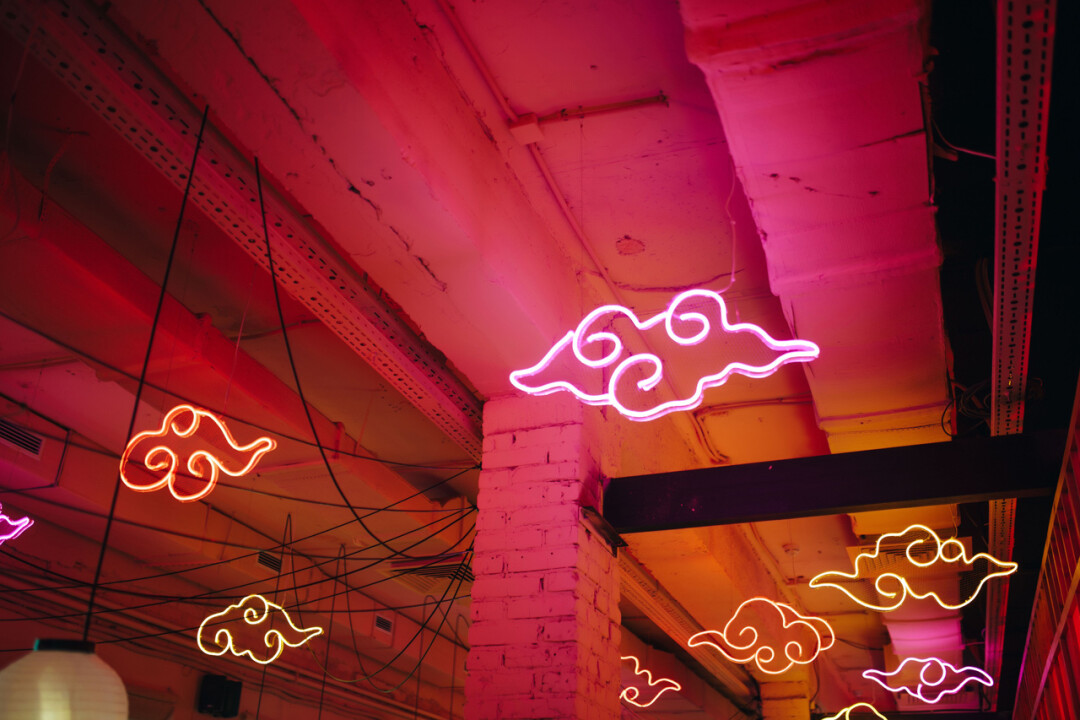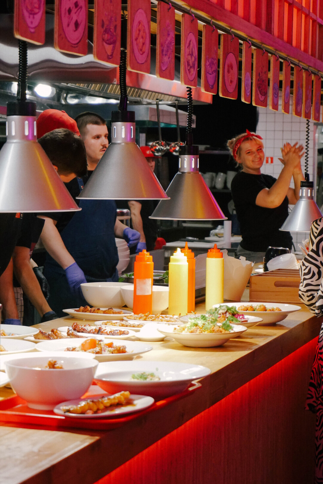 Команда проекта хотела, чтобы помещение второго этажа было простым и светлым, а по вечерам напоминало традиционные китайские кафешки — с красным неоновым светом и обилием азиатских фонариков.