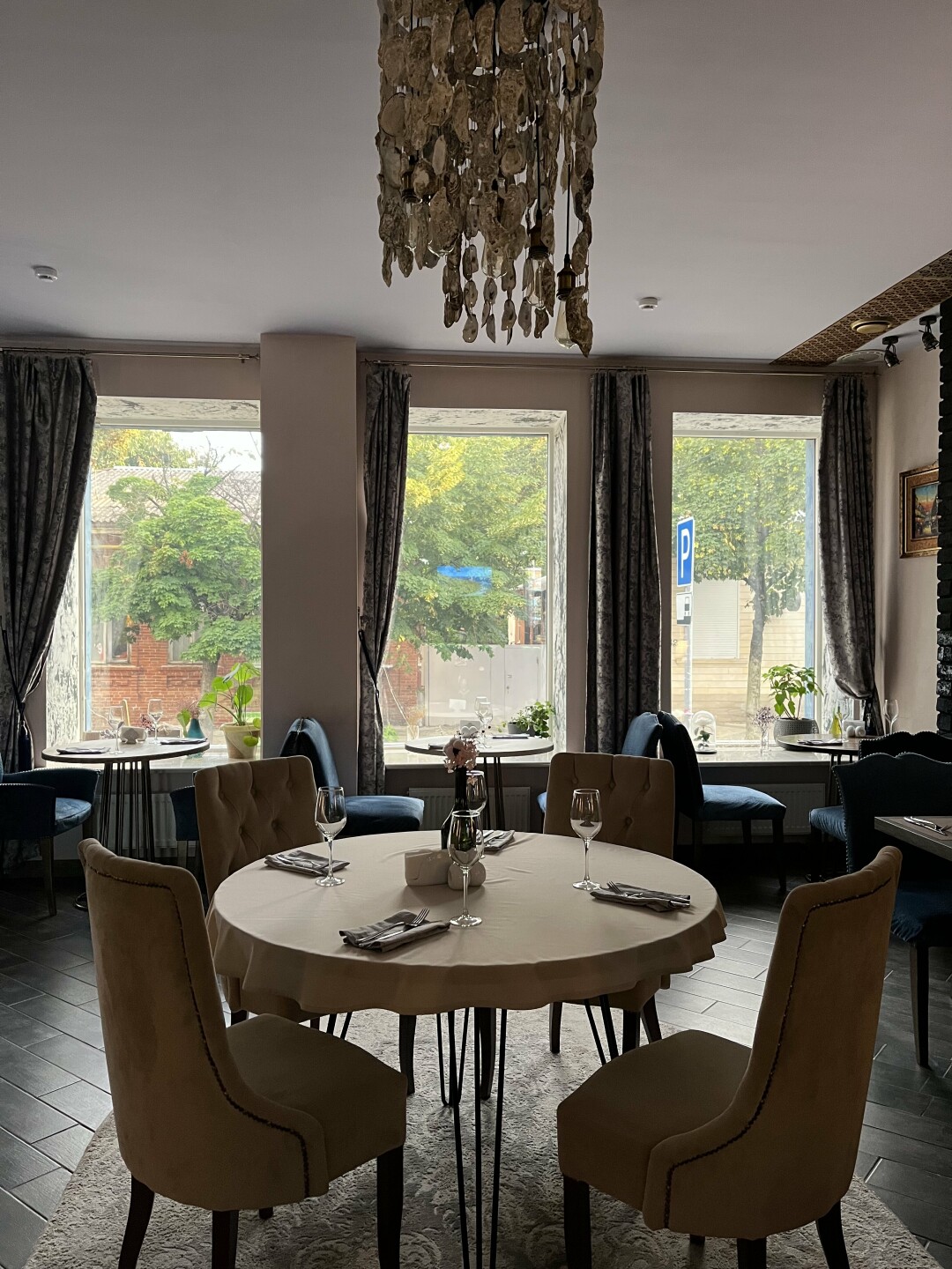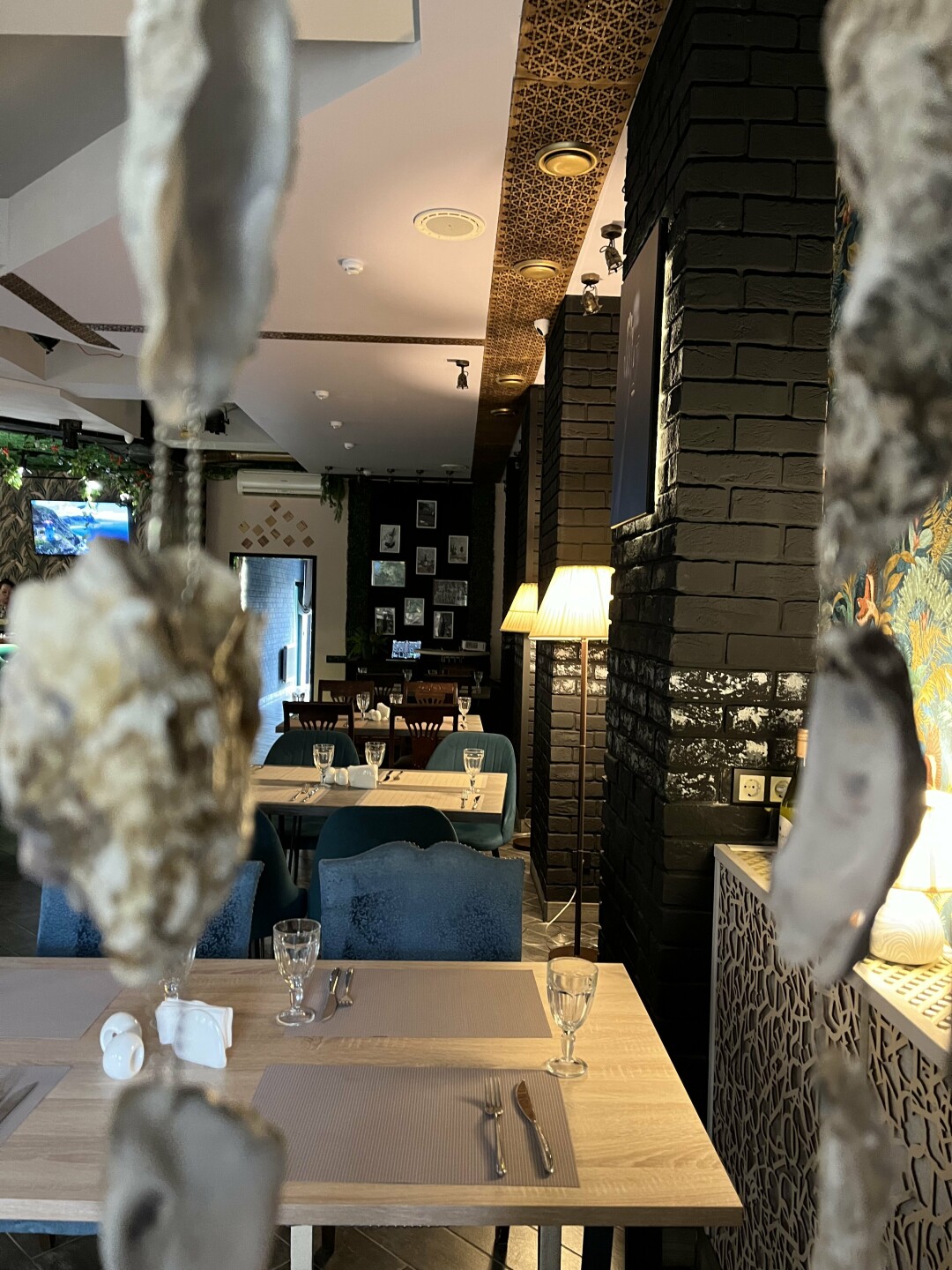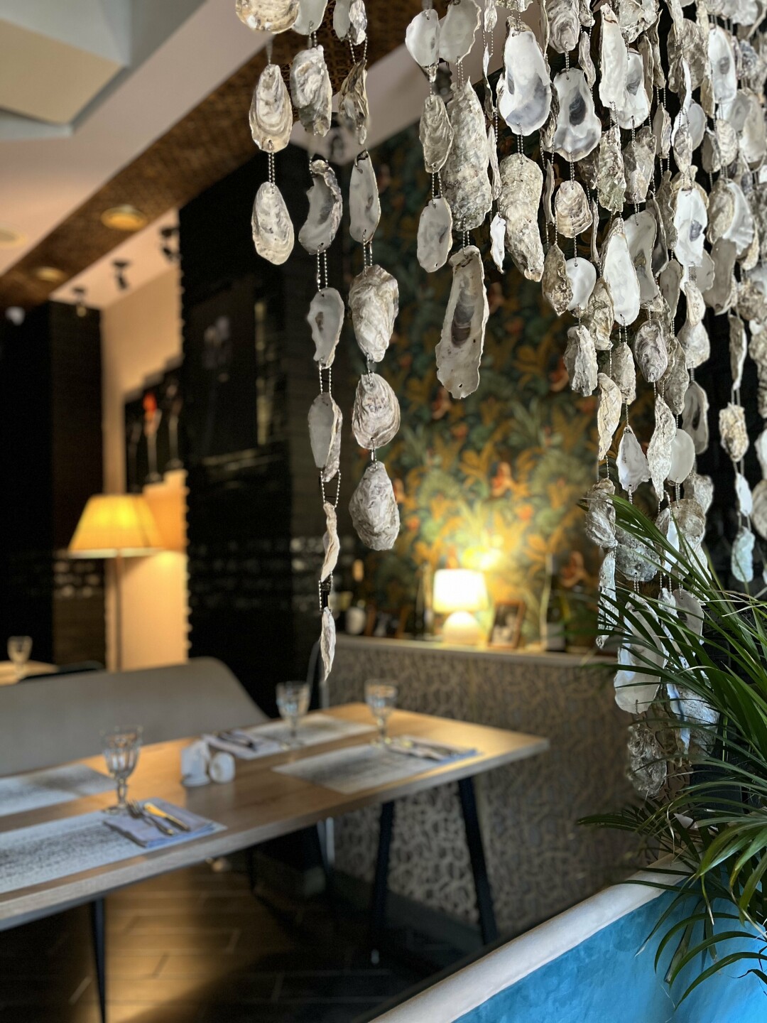 Интерьер ресторана, расположившегося в двухэтажном доме дореволюционной постройки, простой и понятный: классический стиль, хендмейд «шторы» из устричных раковин и похожая люстра, намекающие на морскую тематику проекта, нетронутая старинная кирпичная кладка (за это отдельный респект!) внутри и снаружи, а на закрытом заднем дворе (400 квадратов!) открытая кухня — тут можно смотреть, как готовят ваши мидии, а еще фильмы по выходным.