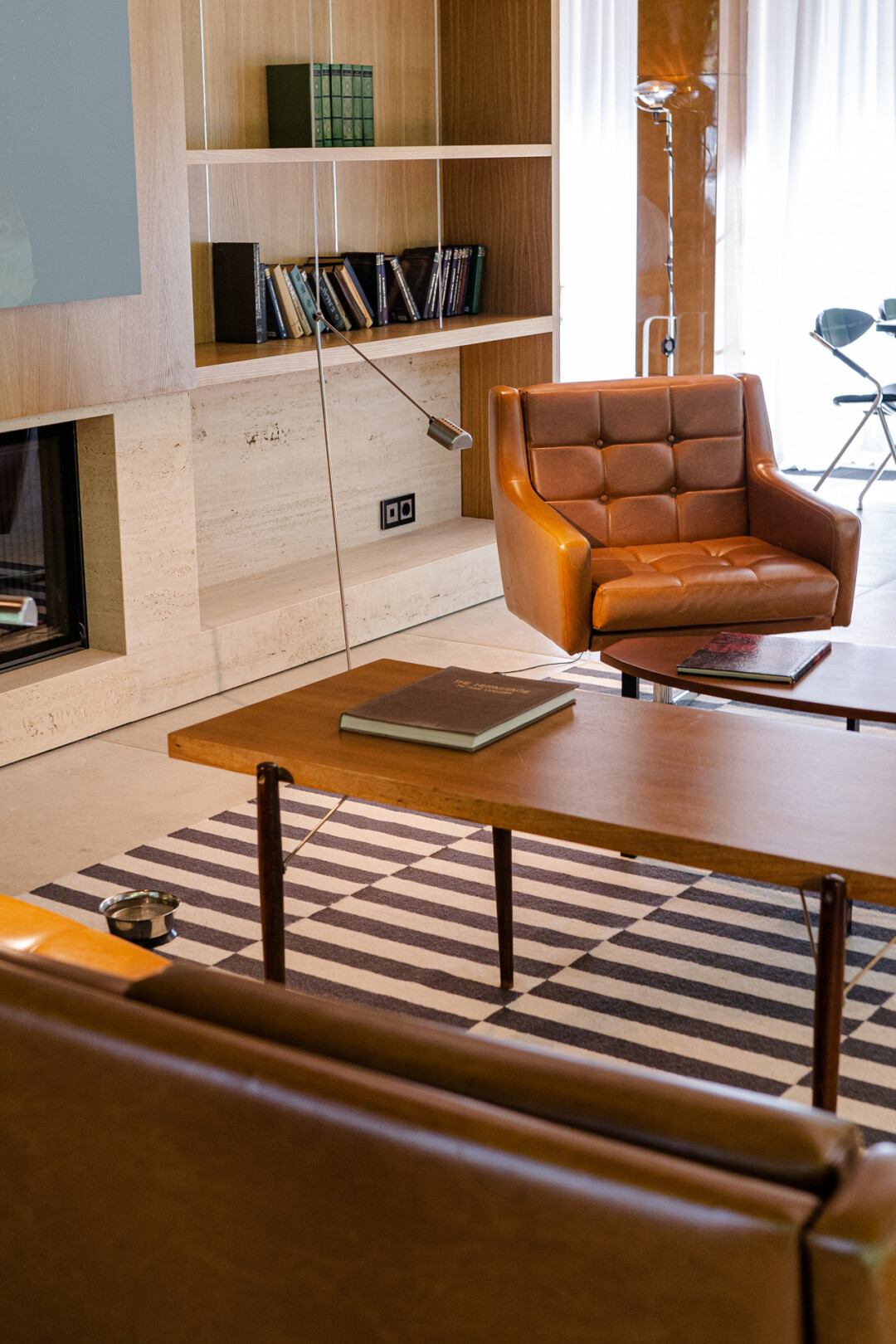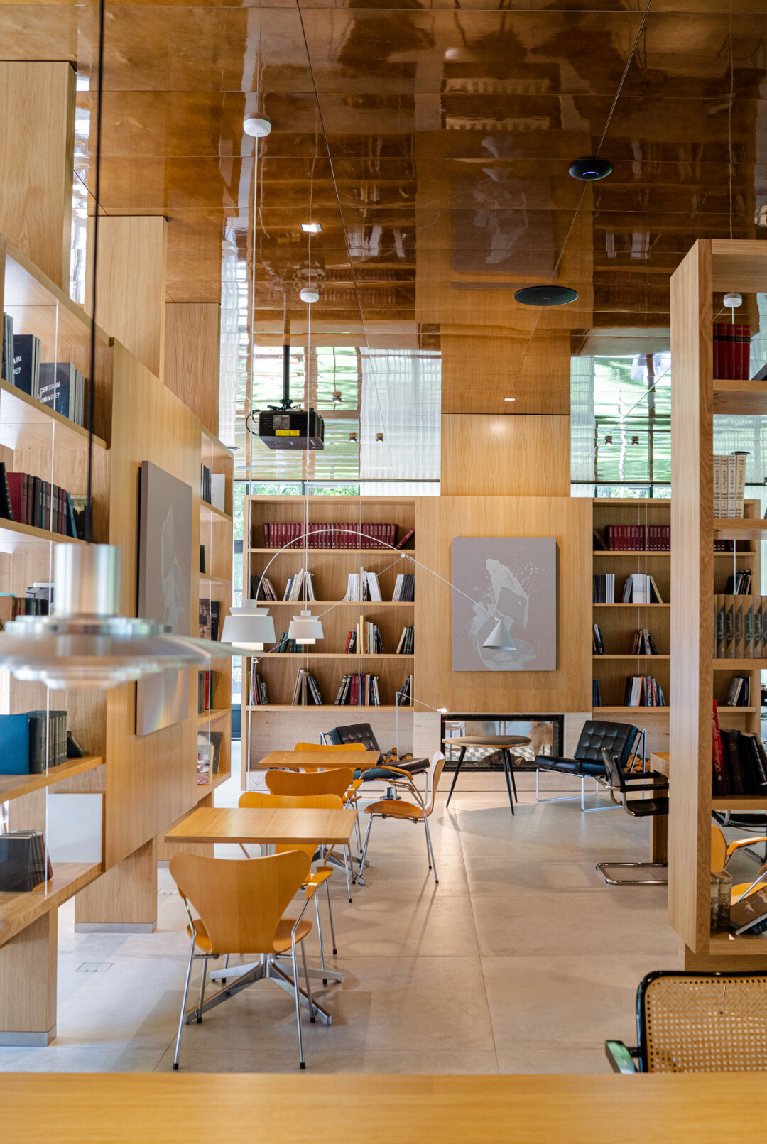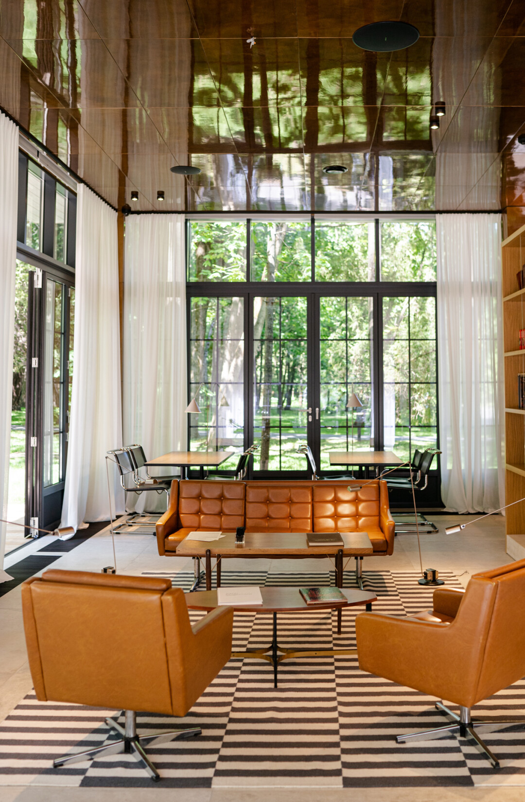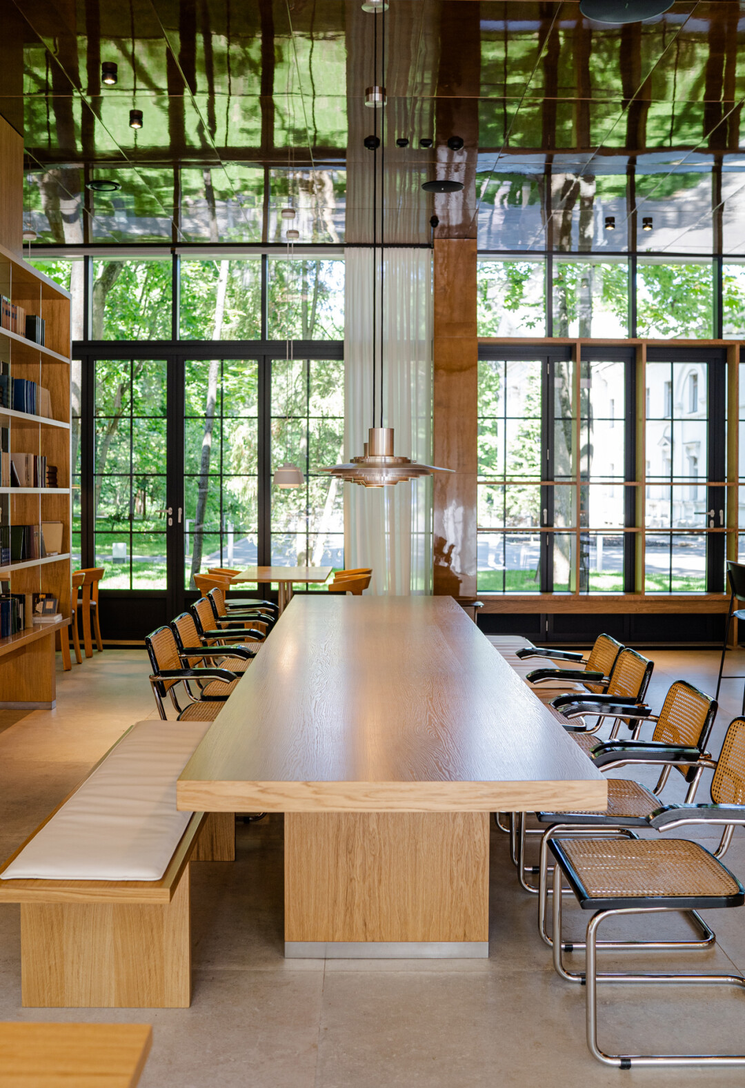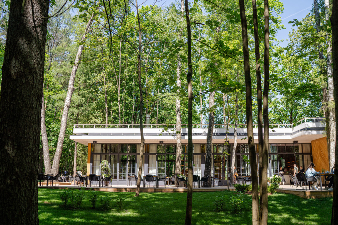 Первого июня для гостей открыл двери легкий, наполненный светом павильон с интерьерами в стиле mid-century. Он стал архитектурным преемником ансамбля Дома творчества Переделкино. Все здесь дышит его историей — интерьер от бюро Studio APAA, вдохновленный исторической библиотекой Дома творчества, творческими кабинетами и архитектурными решениями Мис ван дер Роэ. Здесь и классические баухаусовские стулья, и винтажные кресла 1960-х, и глянцевые потолочные панели, отсылающие к лаку писательского стола. Библиотека — центр пространства. На книжных полках тут собрана подборка произведений переделкинских литераторов. И да, читать тут не только можно, но и нужно — коллекция интересных книг и альбомов постоянно пополняется.