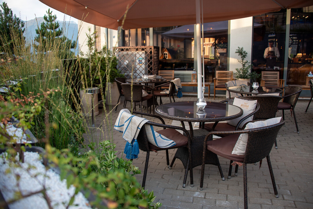 Что до антуража, то концептуально все соблюдено. В интерьере вплоть до мебели и освещения преобладает натуральная айдентика с отсылкой к природным артефактам. Дегустировать блюда от шефа в таком окружении еще приятнее, особенно когда ансамбль дополняется прекрасным видом на горы.