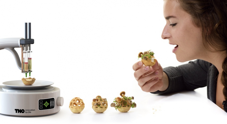 Идеей печати еды на 3D-принтере озабочены все — включая NASA, которые хотят, чтобы их космонавты печатали себе в космосе пиццу. Работает технология примерно так:  слоты для картриджей заполняются нужными ингредиентами. Их принтер преобразует в блюда, наращивая в определенном порядке. Правда, получившееся блюдо нужно потом разогревать.