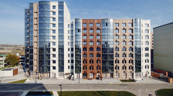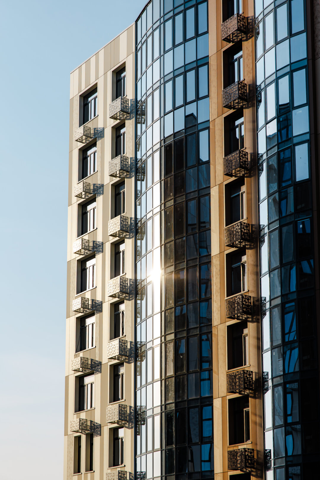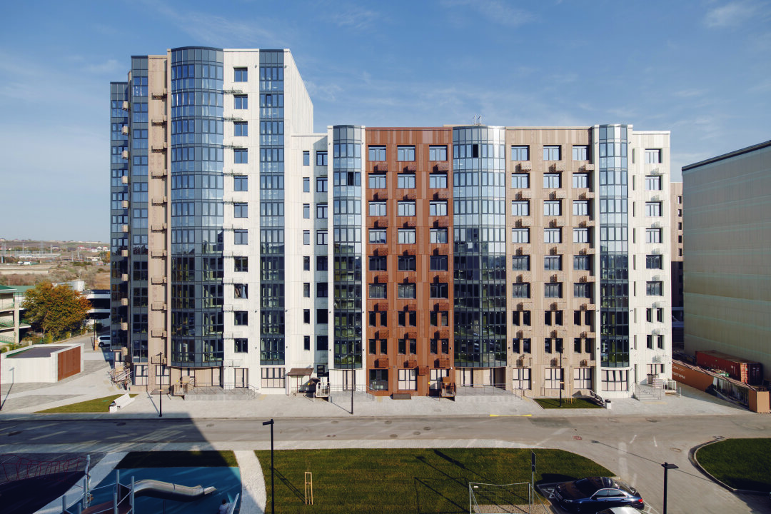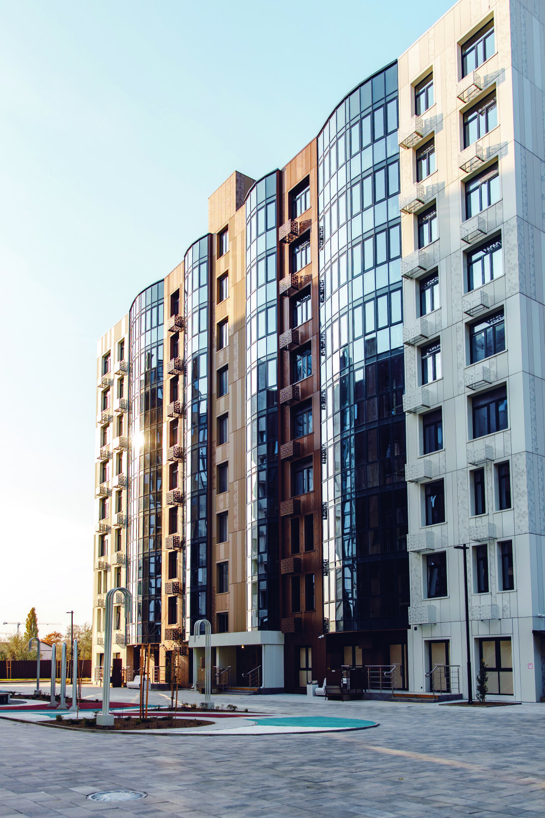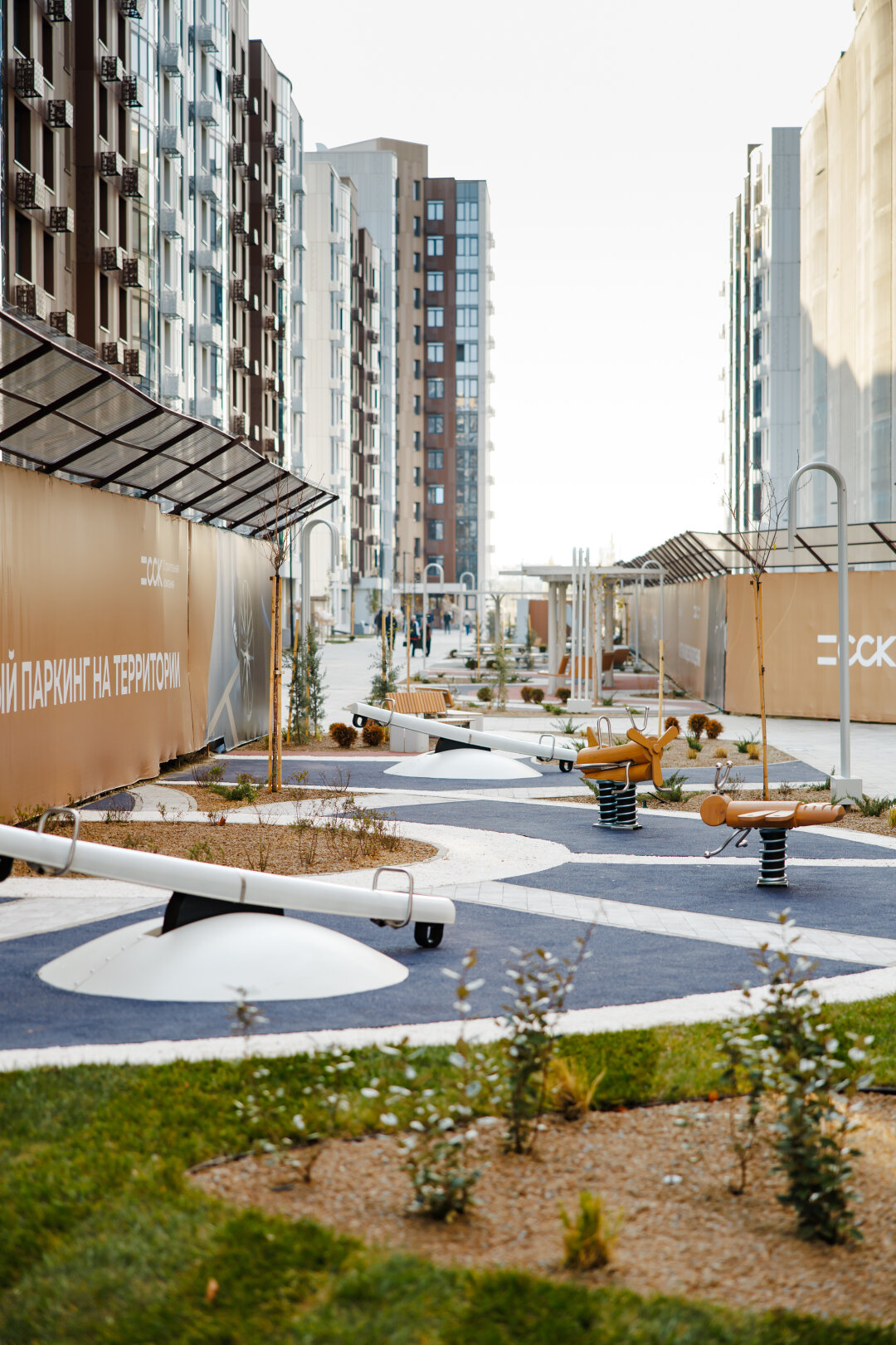 В составе комплекса — несколько жилых корпусов высотой от 9 до 12 этажей, предлагающих 532 квартиры. Планировки предлагают разные варианты: от экономичных однокомнатных квартир площадью 33 м² до двухкомнатных апартаментов размером 62 м². Особое внимание уделено качеству отделки входных групп, где применяются натуральные материалы: мрамор, стекло и металлические конструкции. Концепция закрытой территории, свободной от транспорта, создает особую атмосферу приватности и защищенности. На территории организована многоуровневая система безопасности, включающая видеонаблюдение с обработкой данных искусственным интеллектом для оперативного реагирования. Для автомобилей предусмотрен паркинг на 226 мест с зарядными станциями для электрокаров.
