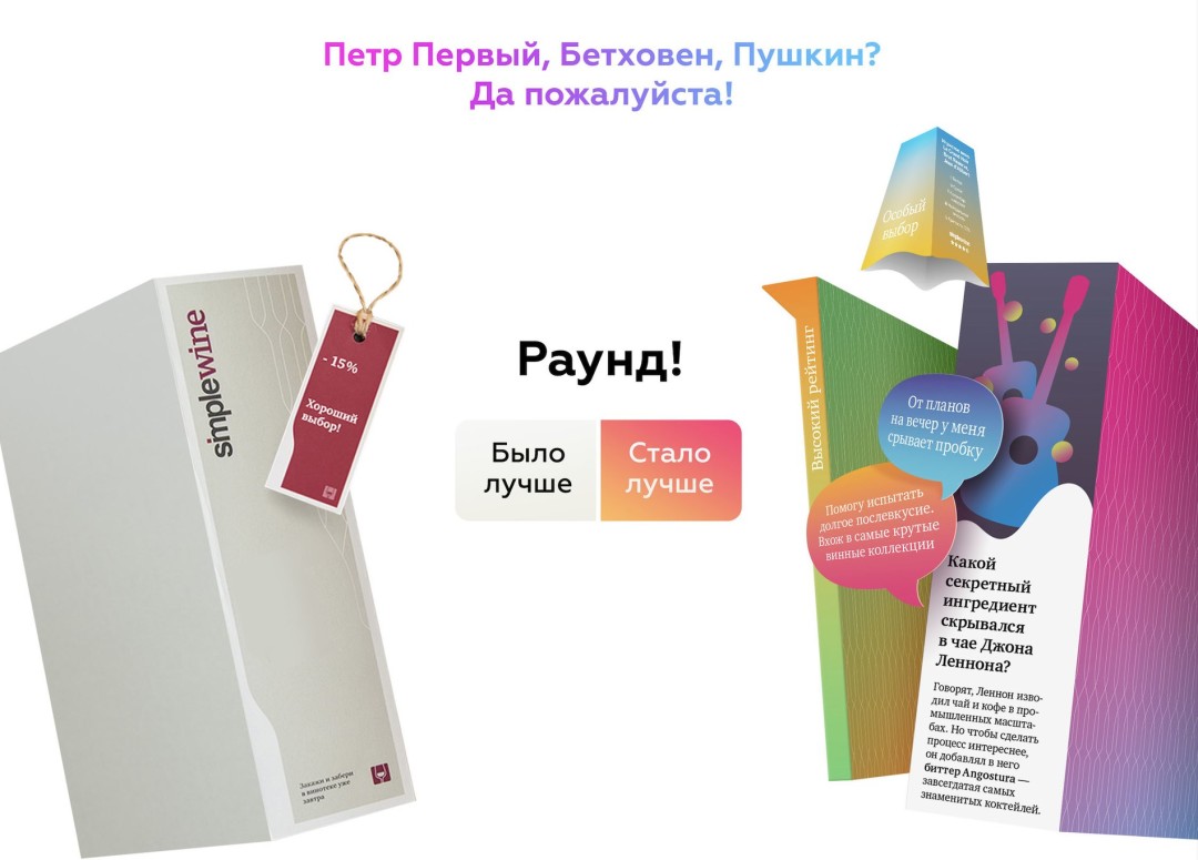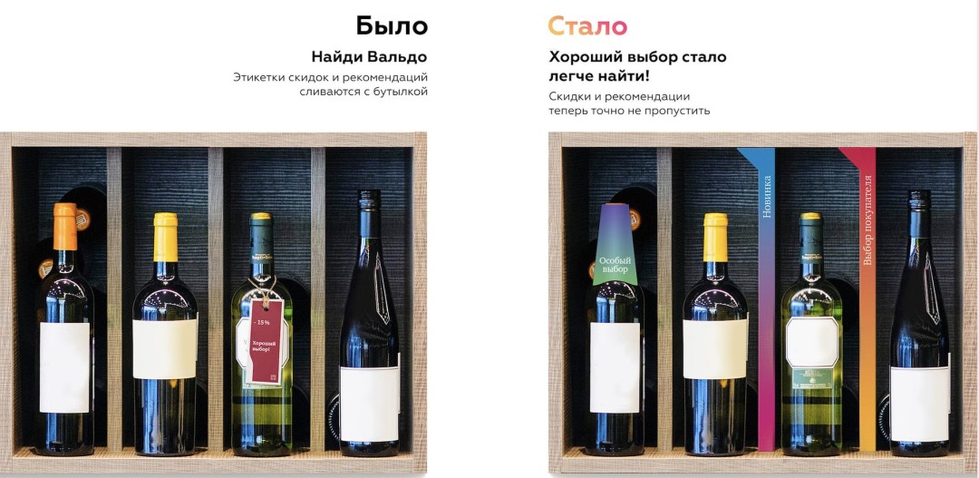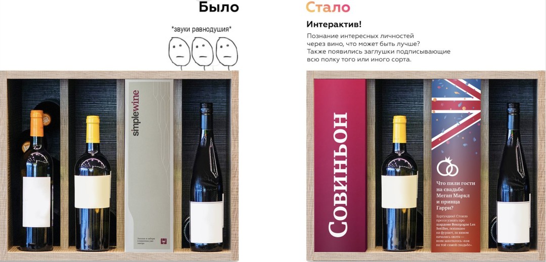 - Интерактивные заглушки для полок с вином с интересными фактами о напитках. Например, что пили гости на свадьбе Меган Маркл и принца Гарри или какой сорт предпочитал Петр I;