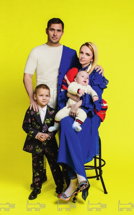 Милана Тюльпанова, Александр Кержаков. На Артемии: комбинезон Gucci (ДЛТ) На Игоре: костюм и рубашка Dolce and Gabbana, обувь Il Gufo (все — ДЛТ) На Милане: водолазка Diane von Furstenberg