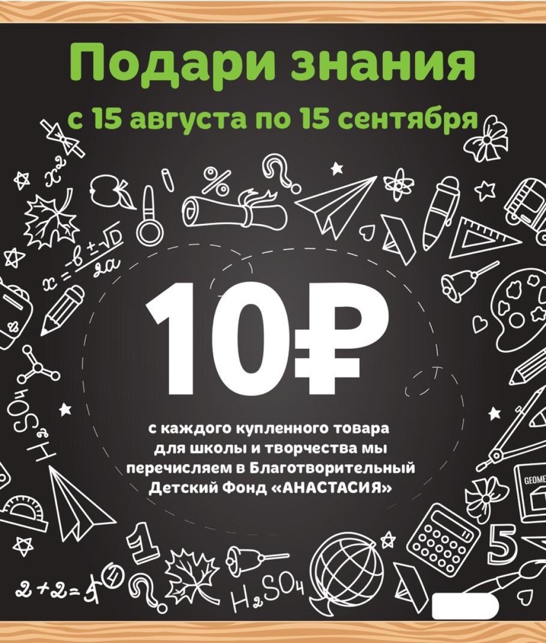 С 15 августа по 15 сентября жители Краснодара и Новороссийска, совершая покупки в супермаркетах «Табрис», могут присоединиться к благотворительной акции «Подари знания». В пользу Благотворительного Детского Фонда «АНАСТАСИЯ» будет перечислено 10 рублей c каждого купленного товара для школы. Собирая в школу своих детей, участники акции одновременно помогают собраться в школу подопечным фонда.