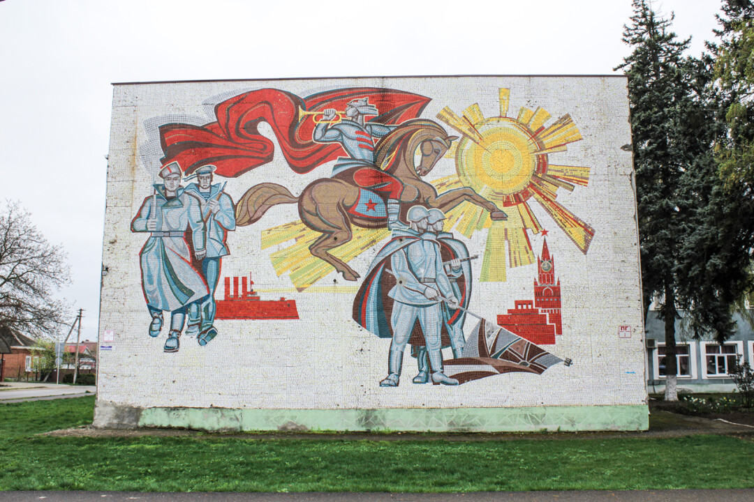 Очевидно, что советская мозаика как явление несет не только декоративную функцию. Ее не зря причисляют к монументальному искусству, и речь тут не только о масштабах. Ее рисовали и выкладывали в том числе с мыслью о нас, будущих поколениях, и, разумеется, о предыдущих. Мозаика должна была увековечить в памяти подвиги предков. На панно в Усть-Лабинске мы видим довольно частый сюжет — исторический. Слева изображено, какой ценой строилось Советское государство: матросы и крейсер «Аврора» символизируют Октябрьскую революцию, красноармеец на коне в буденовке — Гражданскую войну, солдаты на Красной площади — Великую Отечественную войну. А на втором панно то, чего достигло это самое государство: научные открытия, покорение космоса и мирное существование. Имя автора мне, к сожалению, установить не удалось. Есть догадки, что это художник Иван Коновалов, но это неточно.