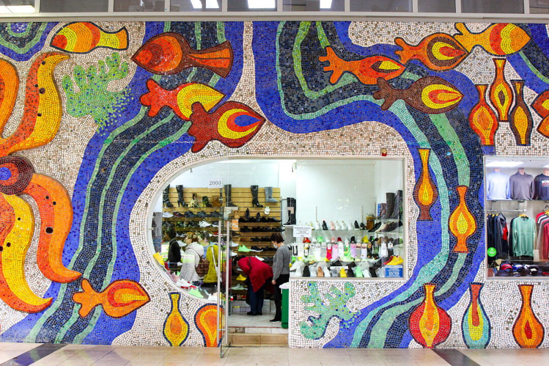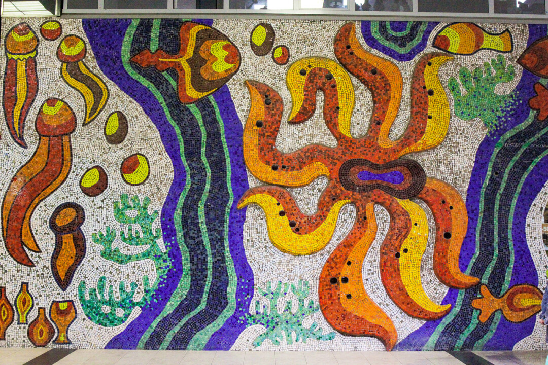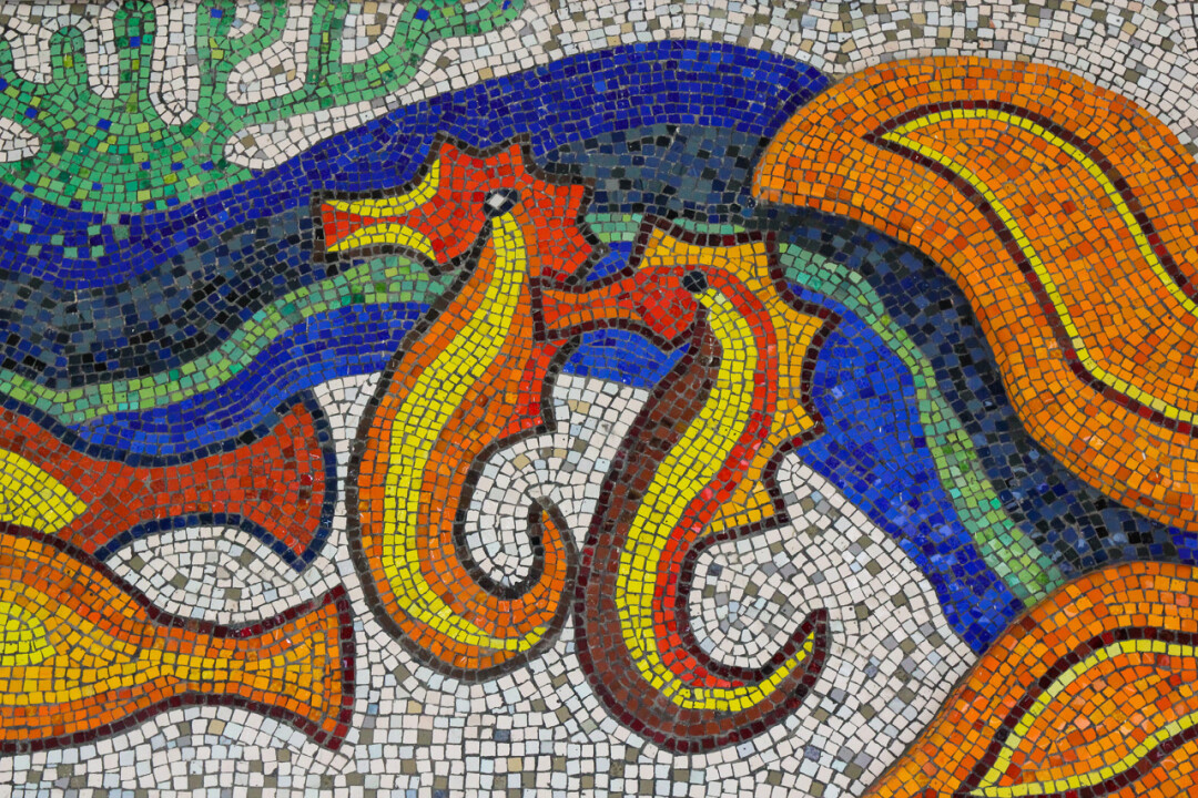 Пожалуй, одна из самых уникальных мозаик в Сочи — это работа, без преувеличения, великого художника-монументалиста Зураба Церетели. Он известен своими работами в Абхазии. Да-да, в голову сразу приходят те самые знаменитые мозаичные автобусные остановки, он и был их автором. Яркая сочинская мозаика находится прямо на центральной пешеходной Навагинской улице, мимо нее действительно сложно пройти (и это прекрасно!) — вся эта морская фауна и такой узнаваемый стиль Церетели бесценны. Это, кстати, не единственная его работа в Сочи, еще одна находится в Адлере в микрорайоне Курортный городок.