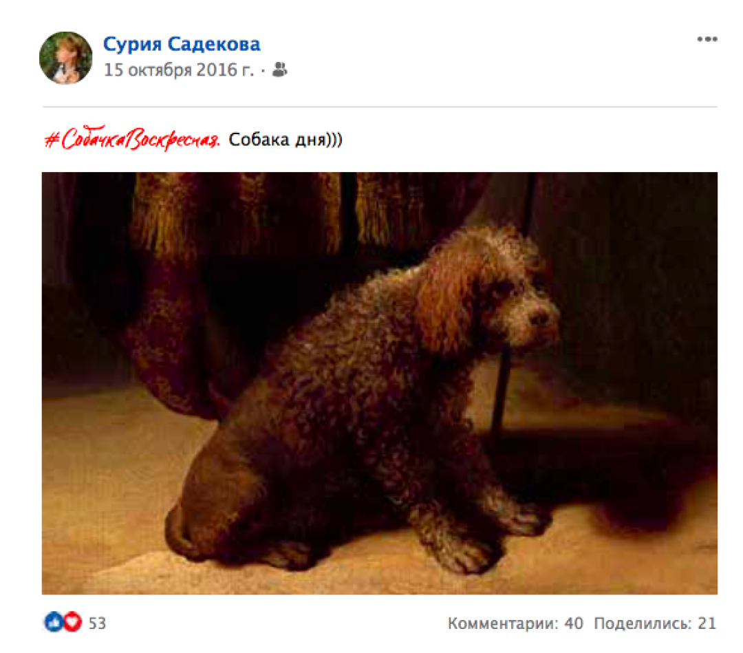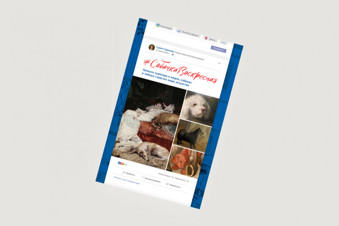 Куратор и заведующая отделом образовательно-выставочных проектов Пушкинского музея Сурия Садекова 4 года писала в соцсетях сюжеты об истории искусства под хэштегов #собачкавоскресная, вдохновленные картинами с изображениями собак: от Фрагонара до Пикассо — по мотивам постов в издательстве Slovo/Слово вышла книга, в поддержку которой снялись с питомцами Ольга Карпуть, Алена Долецкая и Ксения Собчак. Редактор рубрики «Искусство» «Собака.ru» Генералова Александра выбрала самые захватывающие истории: о пуделе Гертруды Стайн, которого запечатлели важнейшие художники 20 века и первом в истории портрете домашних питомцев.