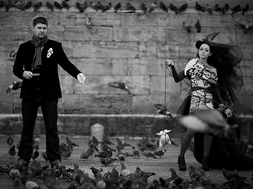 Стамбул — любимый город Алены и Дмитрия. Несколько дней мы изучали его контрасты, подбирали реквизит, вдохновлялись на серию кадров в черно-белых тонах. Безумие началось с самого главного — платья невесты, которое сшито из шторы, купленной в IKEA. А продолжилось в день фотосессии. Когда мы снимали на площади у Гранд-базара, где местные и туристы любят кормить голубей, за нами наблюдало человек триста.