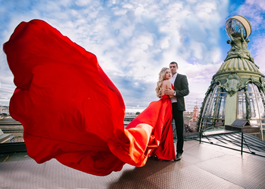 Съемки под кодовым названием «Связанные любовью» прошли в одном из любимейших городов невесты Яны — Петербурге. Цель — сделать атмосферные и wow-эффектные фото для баннеров размером от пола до потолка. С женихом и невестой мы провели два насыщенных дня в потрясающих локациях северной столицы: особняк Брусницыных, крыша дома Зингера и Петергоф. Идеальная погода, развивающийся над Финским заливом трехметровый алый шлейф подарили более сотни кадров.
