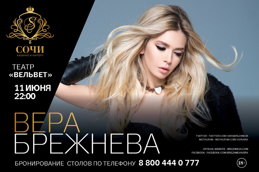 Концерт обворожительной Веры Брежневой пройдет в полюбившемся нашим гостям театре «Вельвет». На концерте вас ждут известные хиты, покорившие все возраста, премьеры, эффектные образы, отличная хореография и море позитива! Поторопитесь занять лучшие места на лучшем шоу в Сочи!