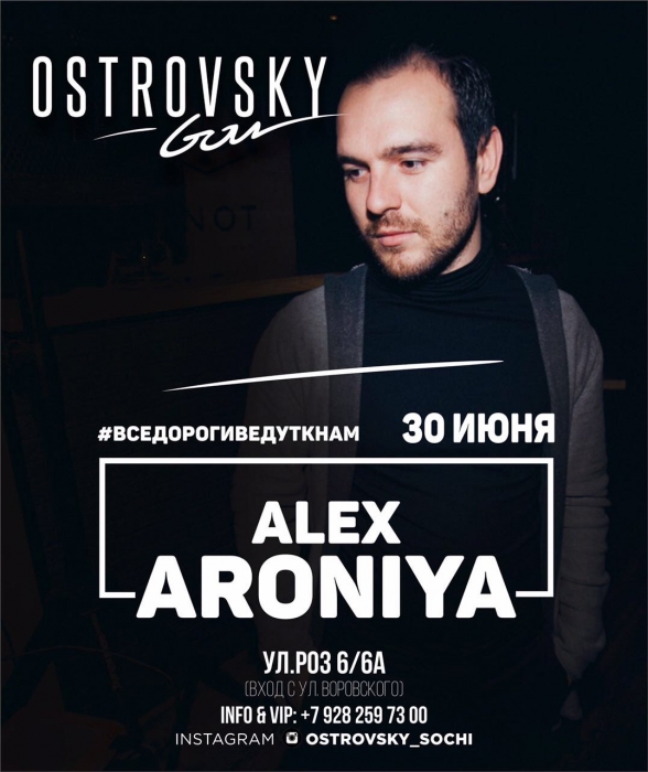 Яркий представитель ди-джеев Юга России, отличается умением найти подход к любому танцполу. Идеальный и бескомпромиссный музыкальный вкус, обладает значительной коллекцией самых танцевальных и разноформатных хитов. В его миксах царит неподражаемая отдача и откровенная атмосфера отличного настроения. Можно сказать, что Alex Aroniya – это один из лучших Mash Up'еров города и края. Неоднократный участник закрытых клубных вечеринок, таких так AfterParty Comedy Club, VIP AfterParty New Wave, AfterParty PLAYBOY, F1 MANSION. Автор многих edit's, ремиксов, которые поддержали как коллеги, так и слушатели. Каждое выступление Aroniya это неповторимое live представление. Высокая техника игры и нестандартная подача музыкального материала - все это удивит даже самую искушенную публику.