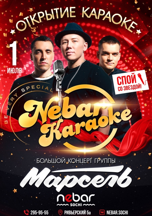 Грандиозный концерт группы Марсель в честь Большого открытия Караоке Nebar! Уникальная возможность для всех жителей и гостей города-курорта познакомиться и спеть дуэтом с легендарной группой на одной сцене! Будем петь и танцевать! Живой звук, фото и видеосъёмка, отличное настроение и гора эмоций обеспечены.